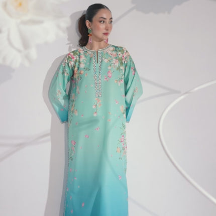 Step into elegance with our Aqua Bloom Printed Kaftan, a graceful piece that flows with sophistication and ease. Crafted in a soft, breathable fabric (ideal in natural crepe or silk blend), this kaftan features a dreamy gradient base that flows from mint green to serene ocean blue — adorned with delicate floral motifs that evoke the freshness of spring.