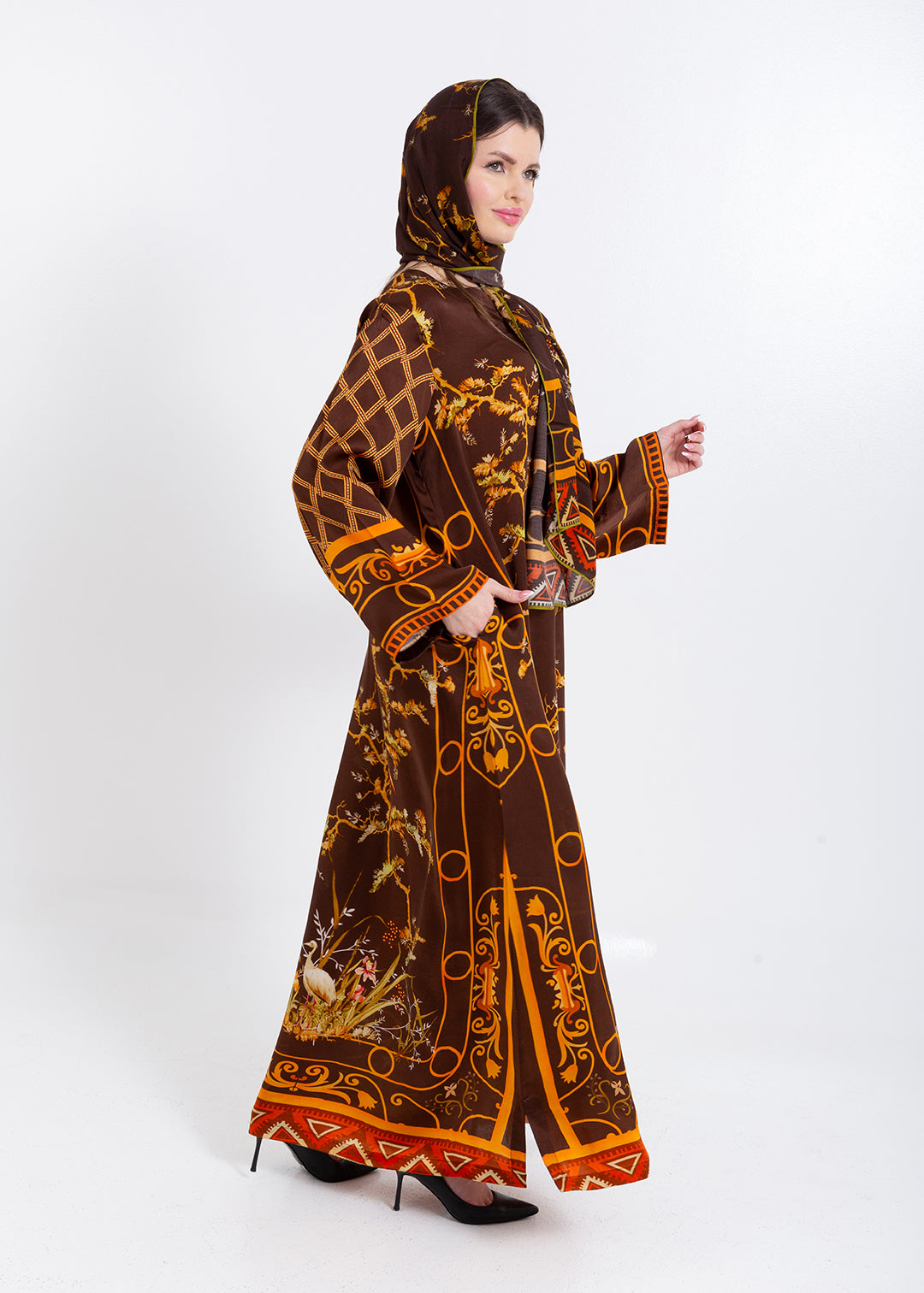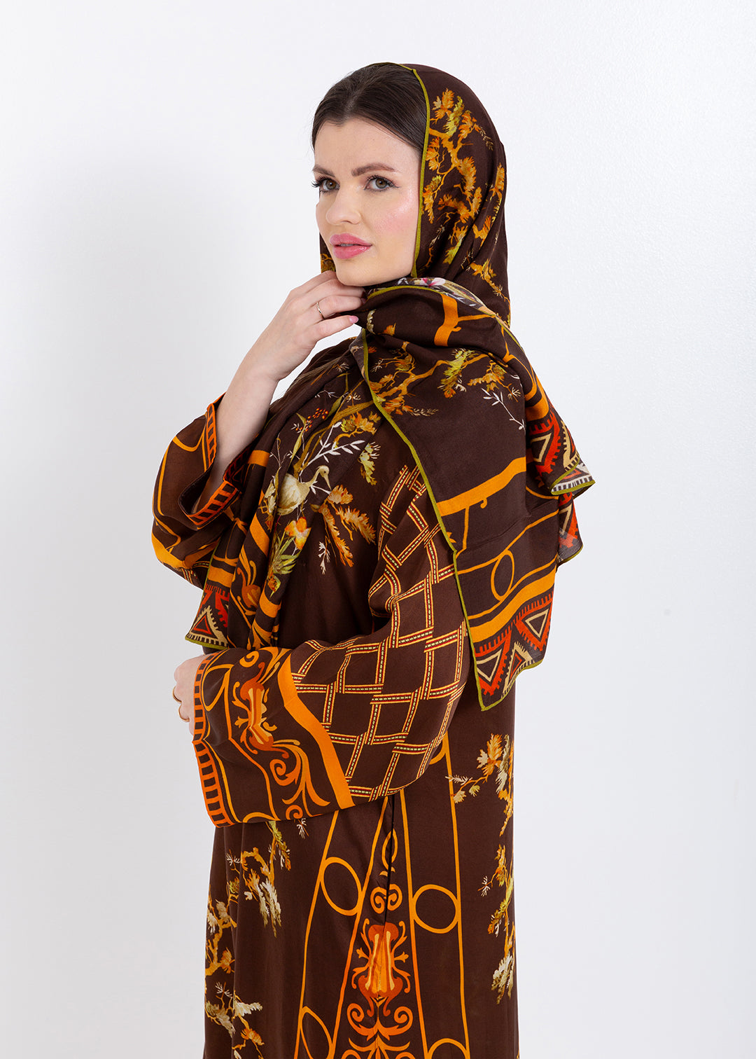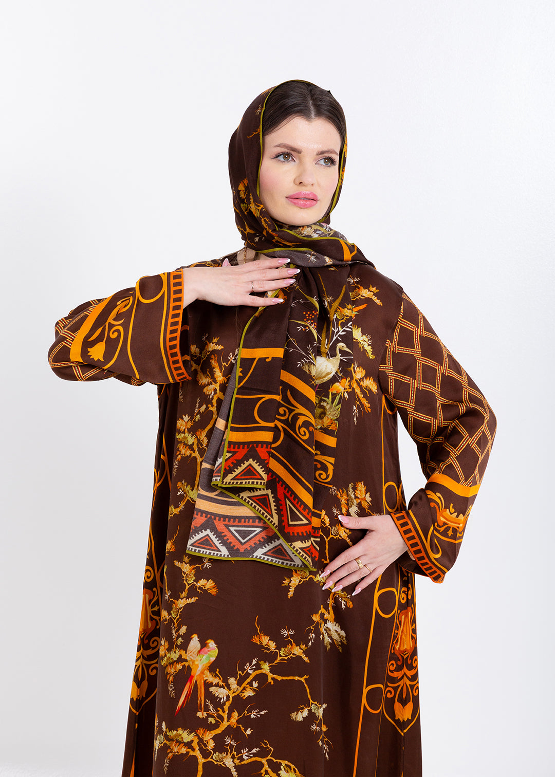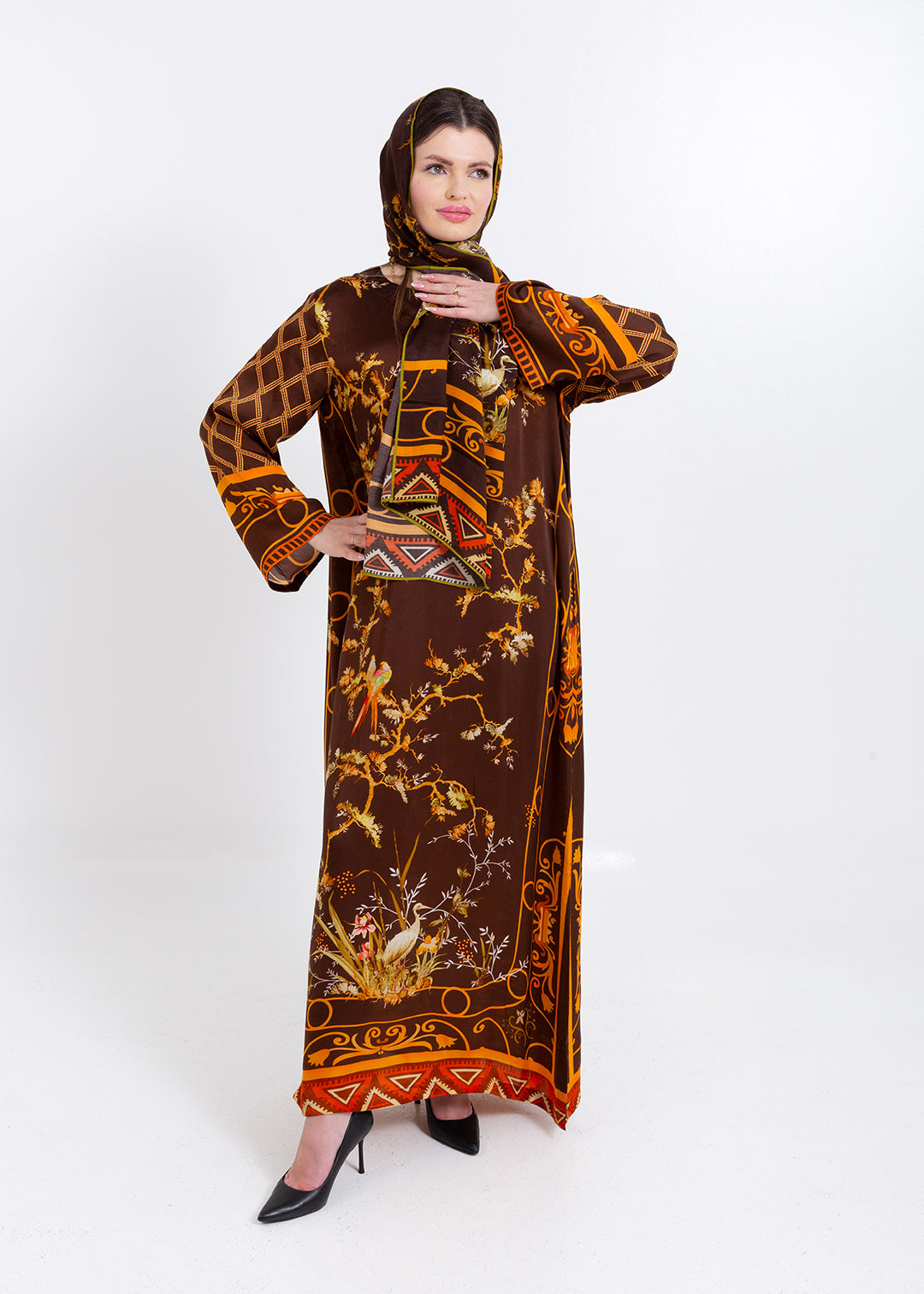 Aurelia Mocha Brown Cupro Satin Kaftan Set with Matching Scarf