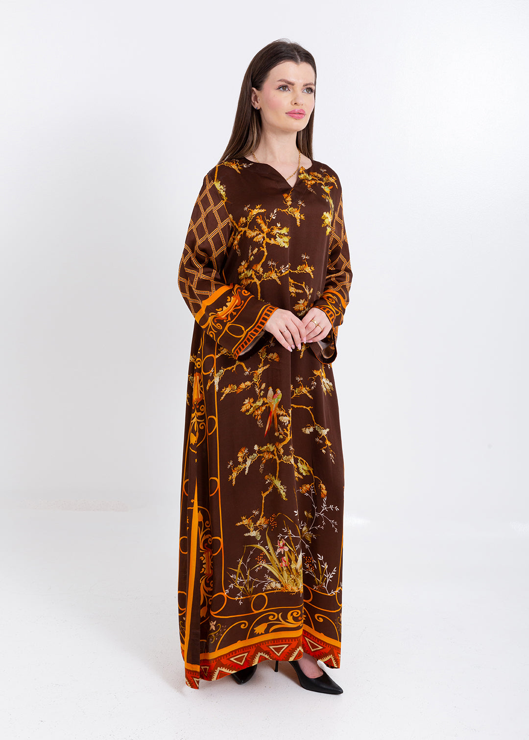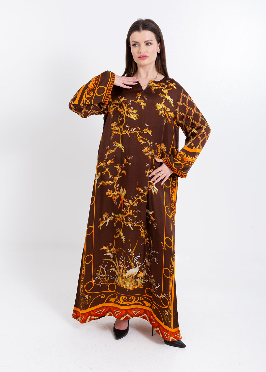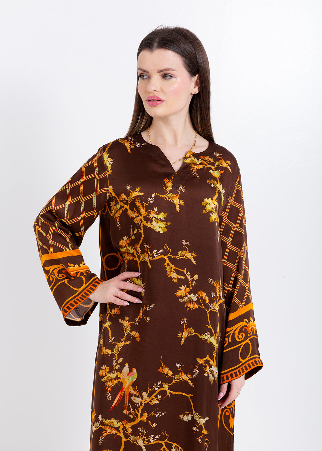 Aurelia Mocha Brown Cupro Satin Kaftan Set with Matching Scarf