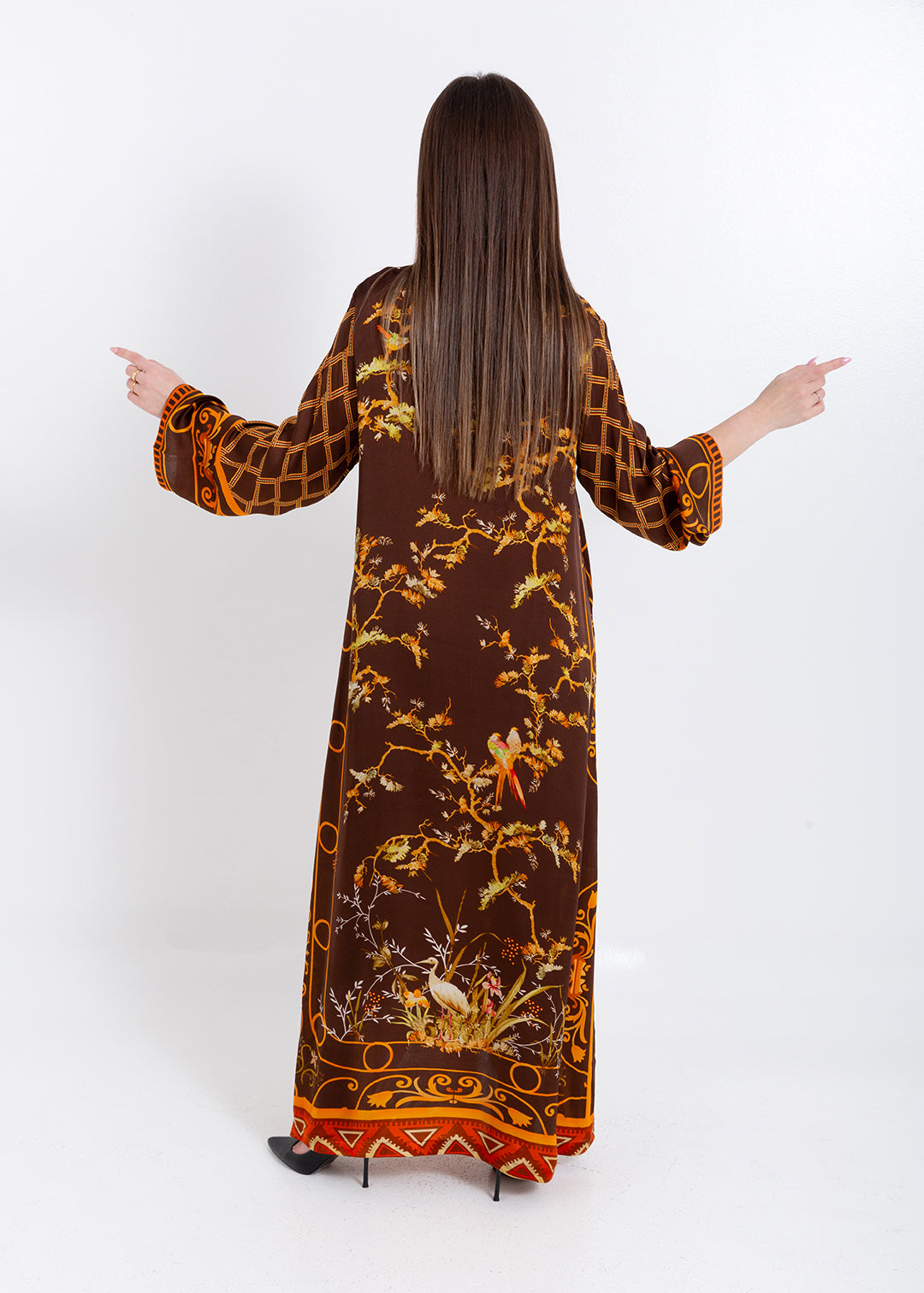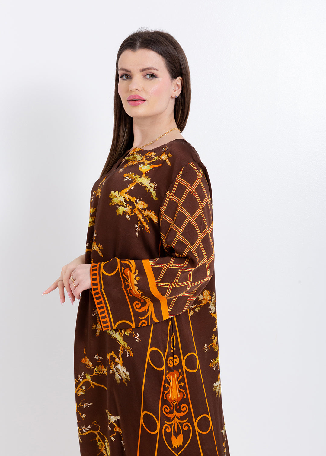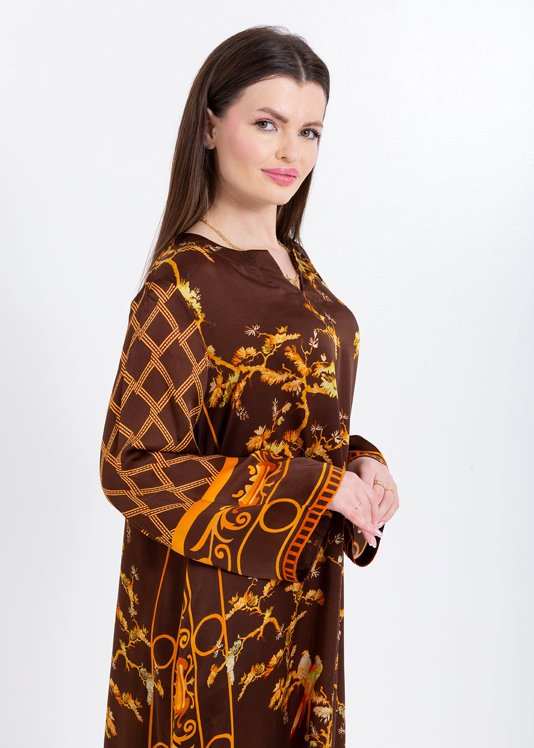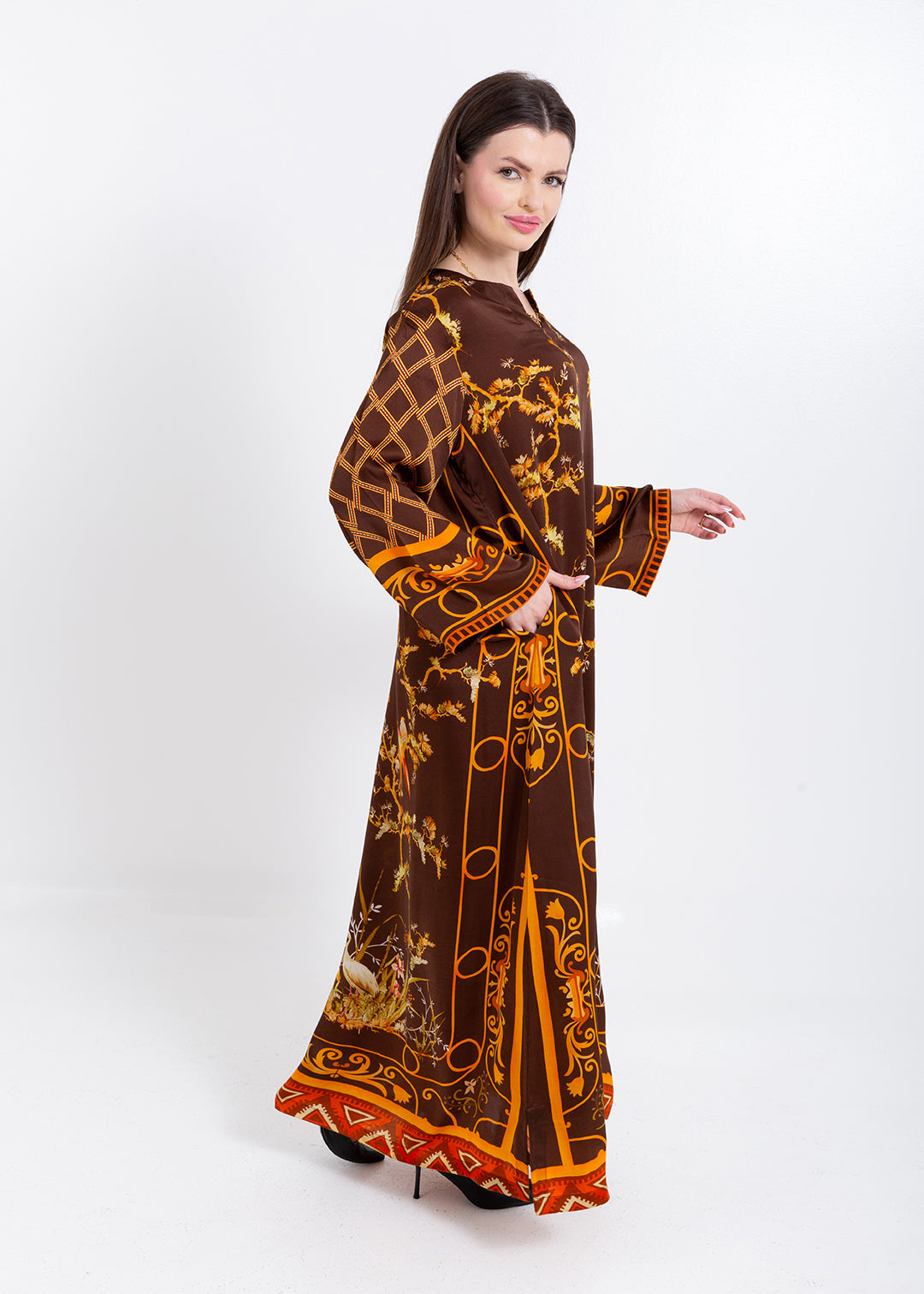 Aurelia Mocha Brown Cupro Satin Kaftan Set with Matching Scarf