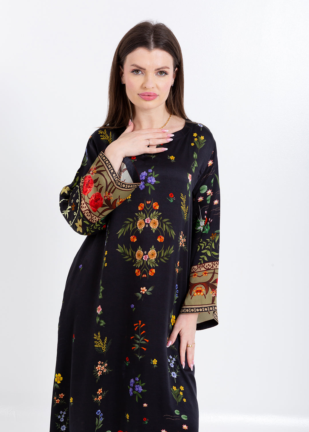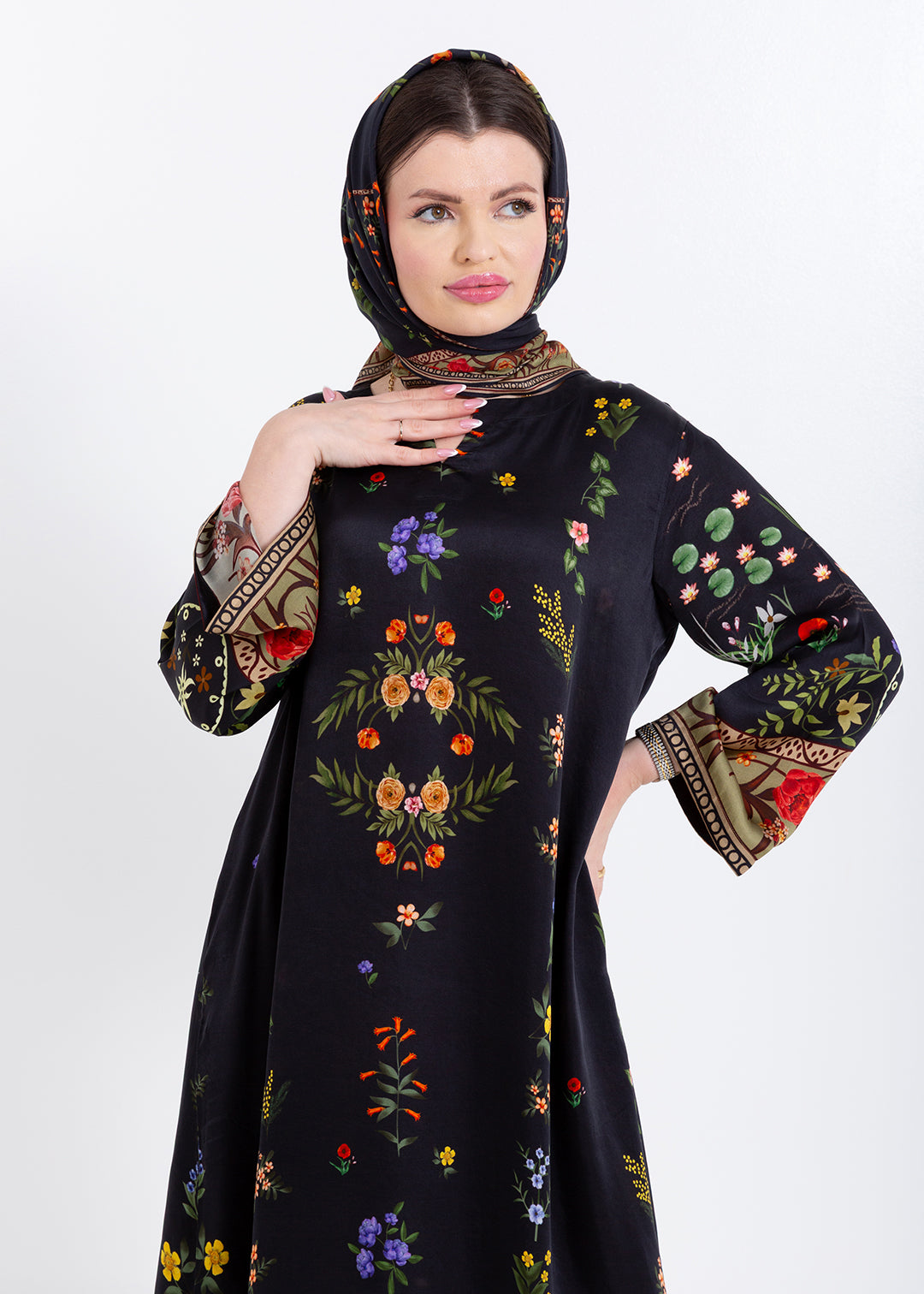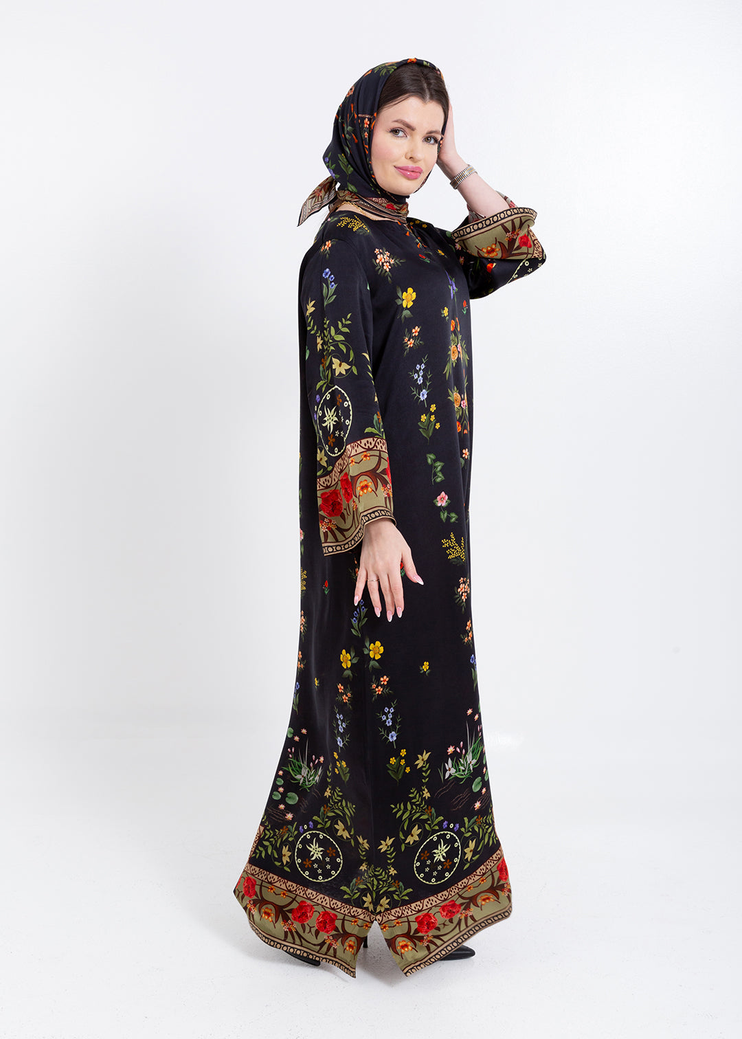 Meher Black Garden Cupro Satin Kaftan Set with Matching Scarf