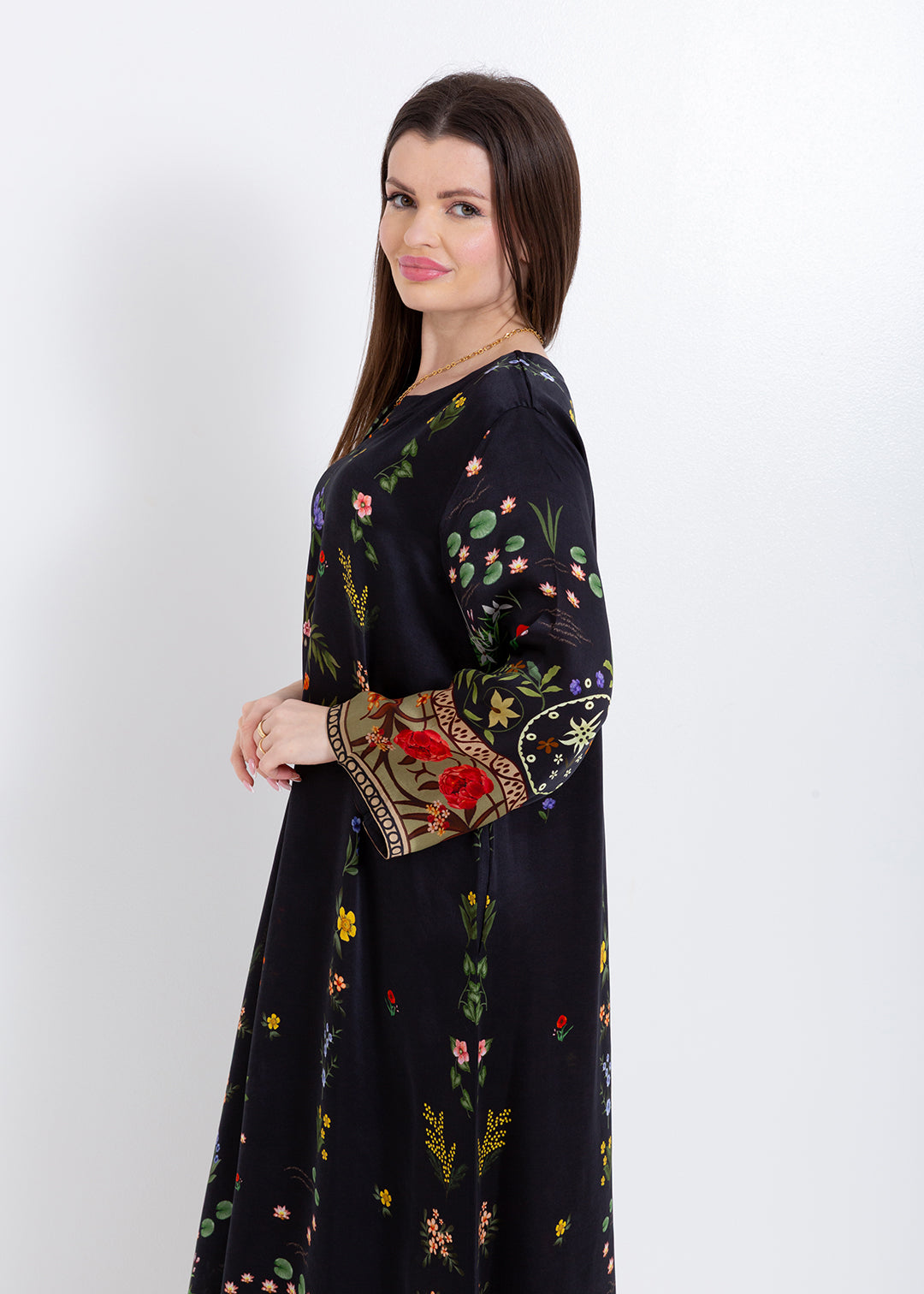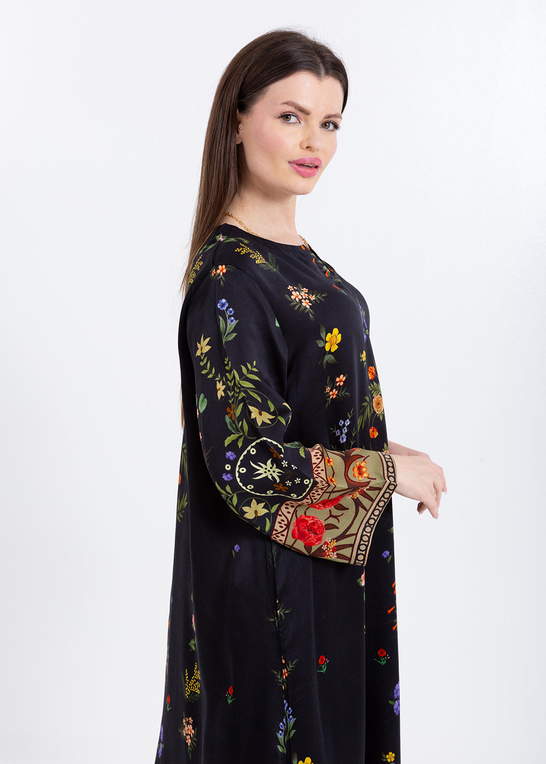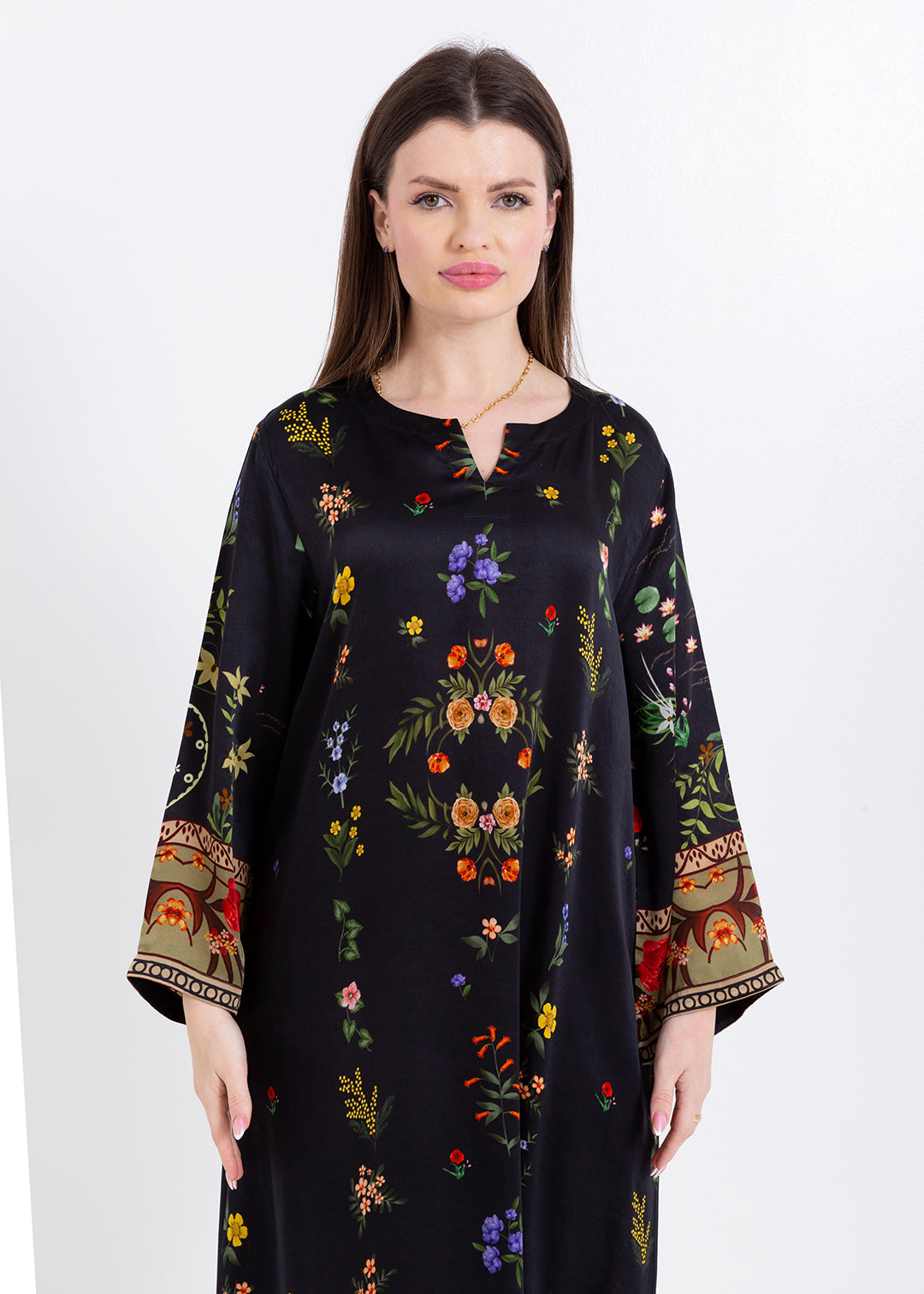 Meher Black Garden Cupro Satin Kaftan Set with Matching Scarf