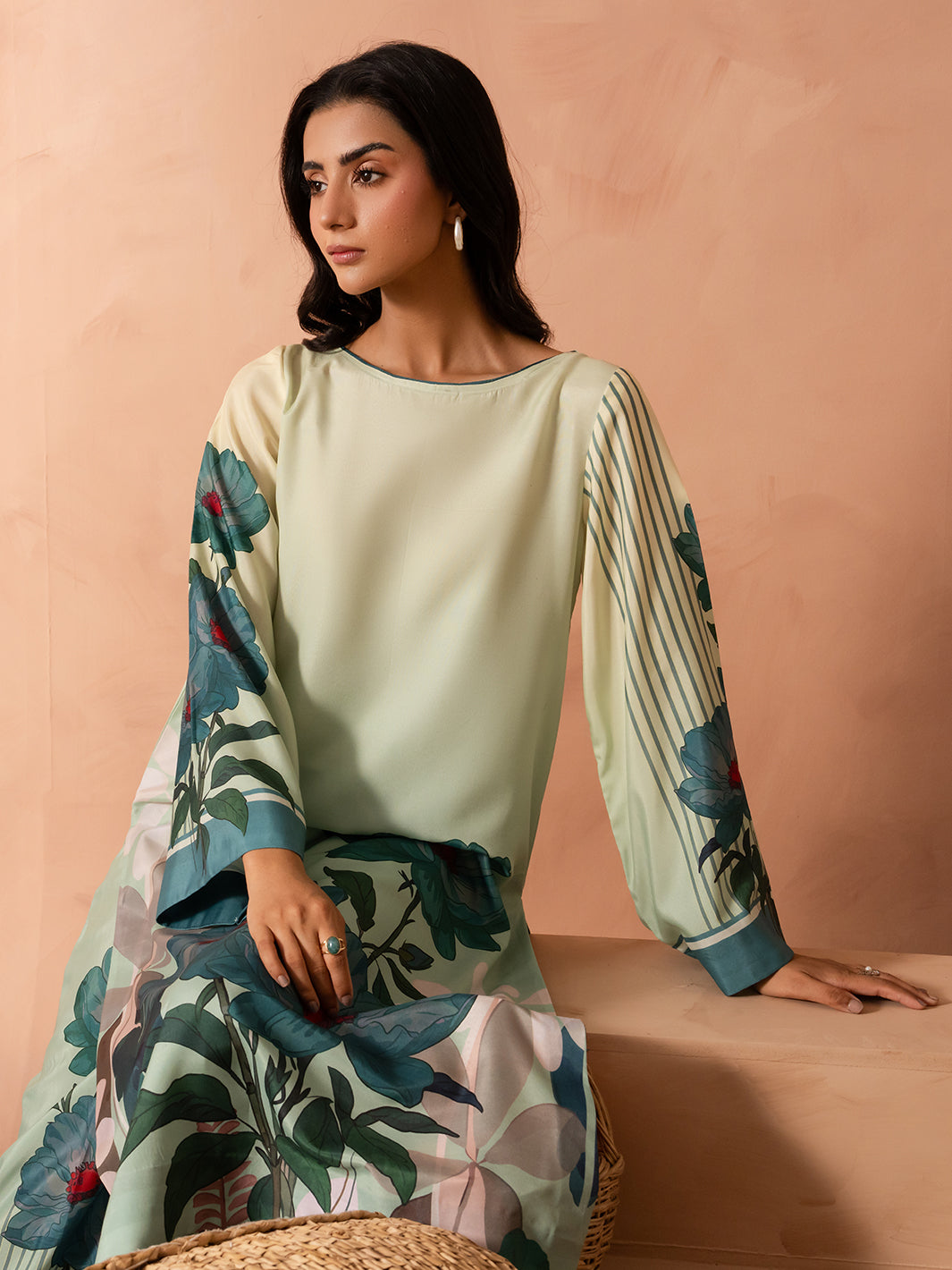 Fresh, feminine, and flowy — the Mint Flora Kaftan is a celebration of graceful minimalism and botanical beauty. Crafted from soft, breathable natural crepe, this kaftan features a serene mint green base brought to life with oversized teal florals and subtle stripe detailing on one sleeve for an unexpected modern twist.