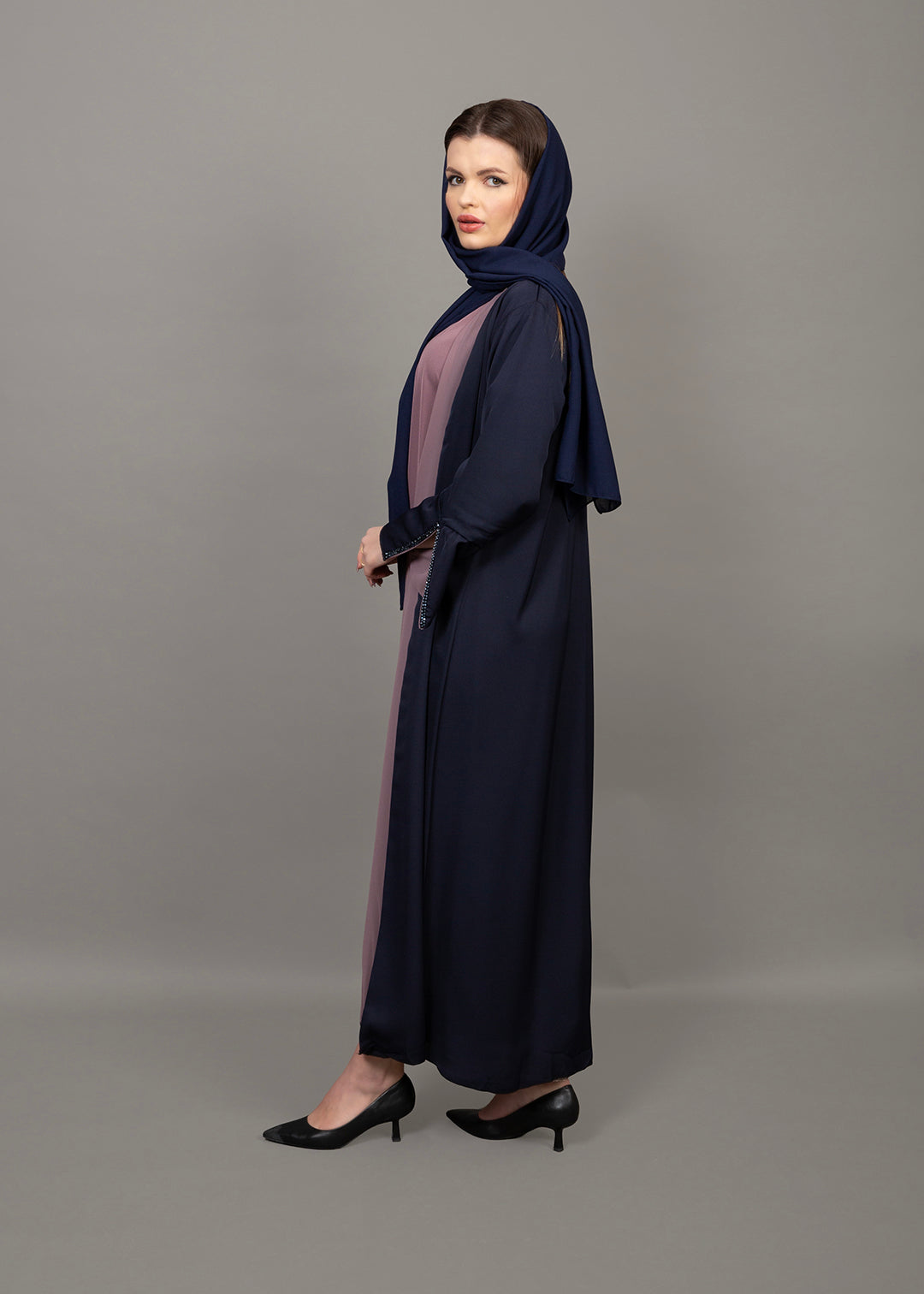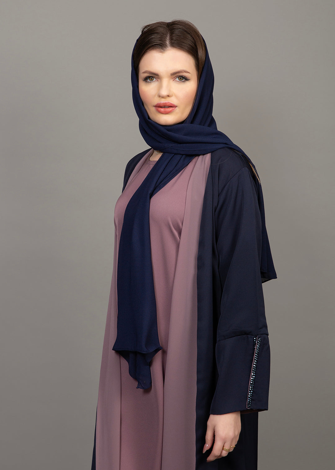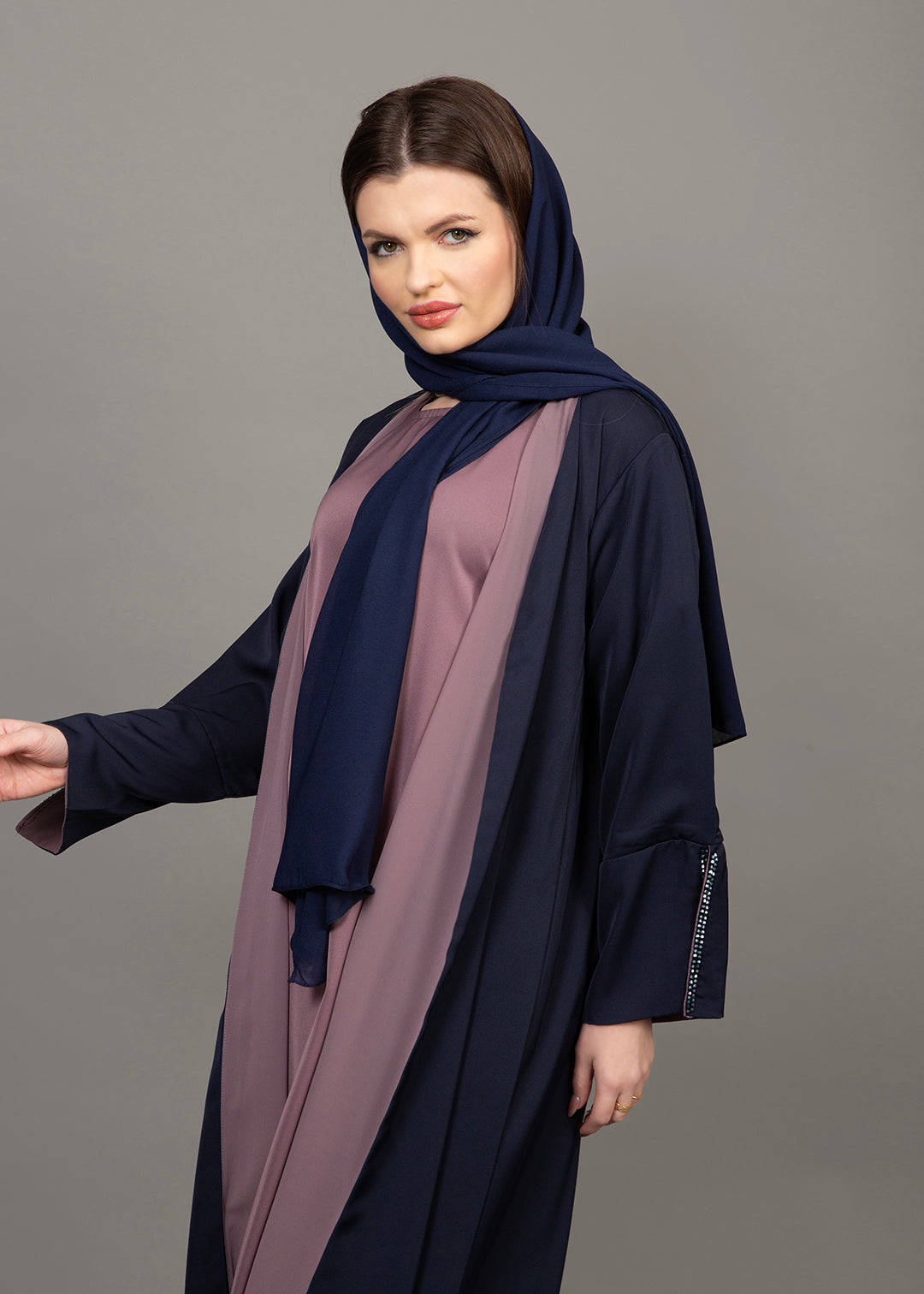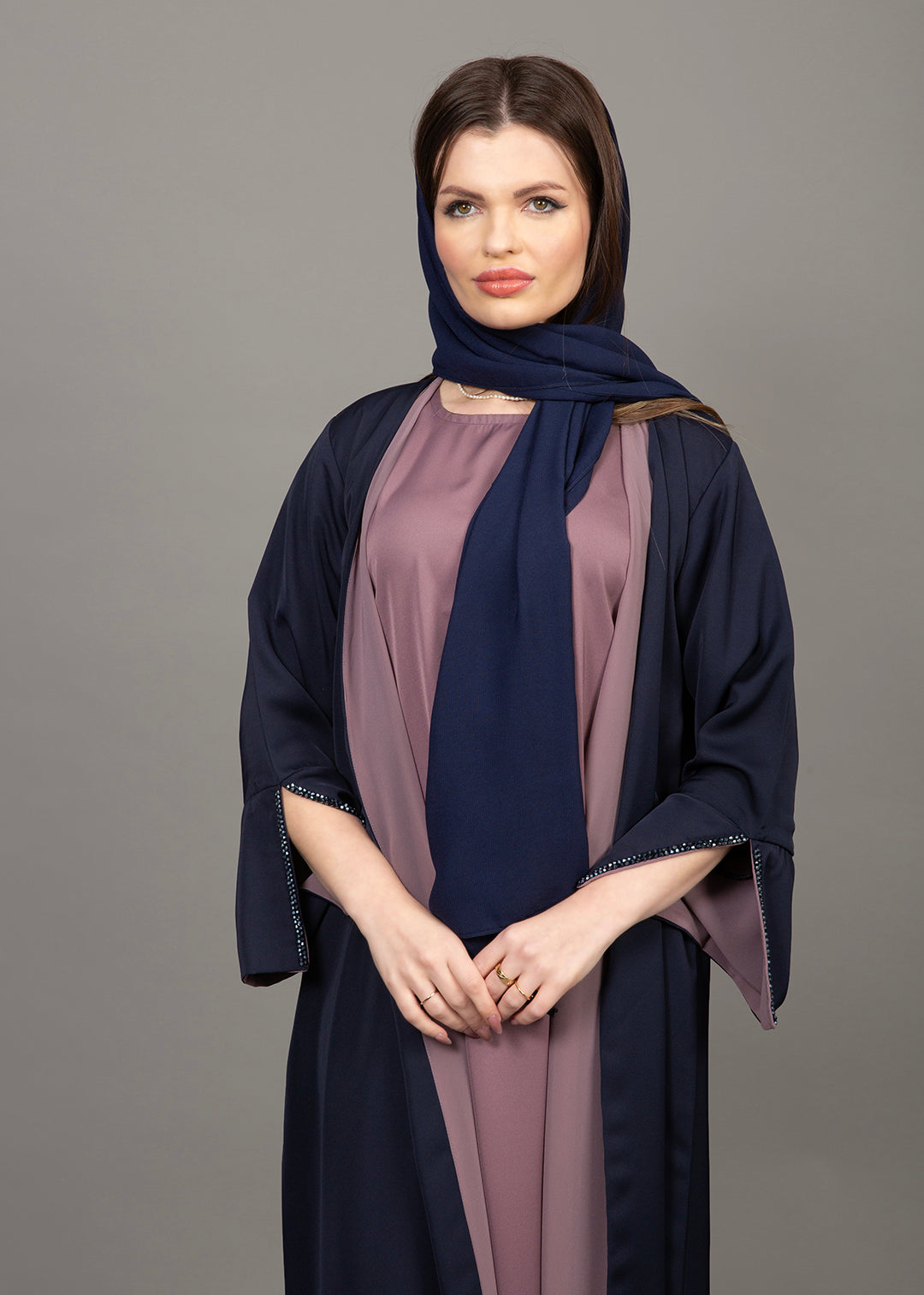 Navy Blue & Mauve 3-Piece Abaya Set Fabric & Quality Crafted from Premium Soft Crepe, known for its breathable and...