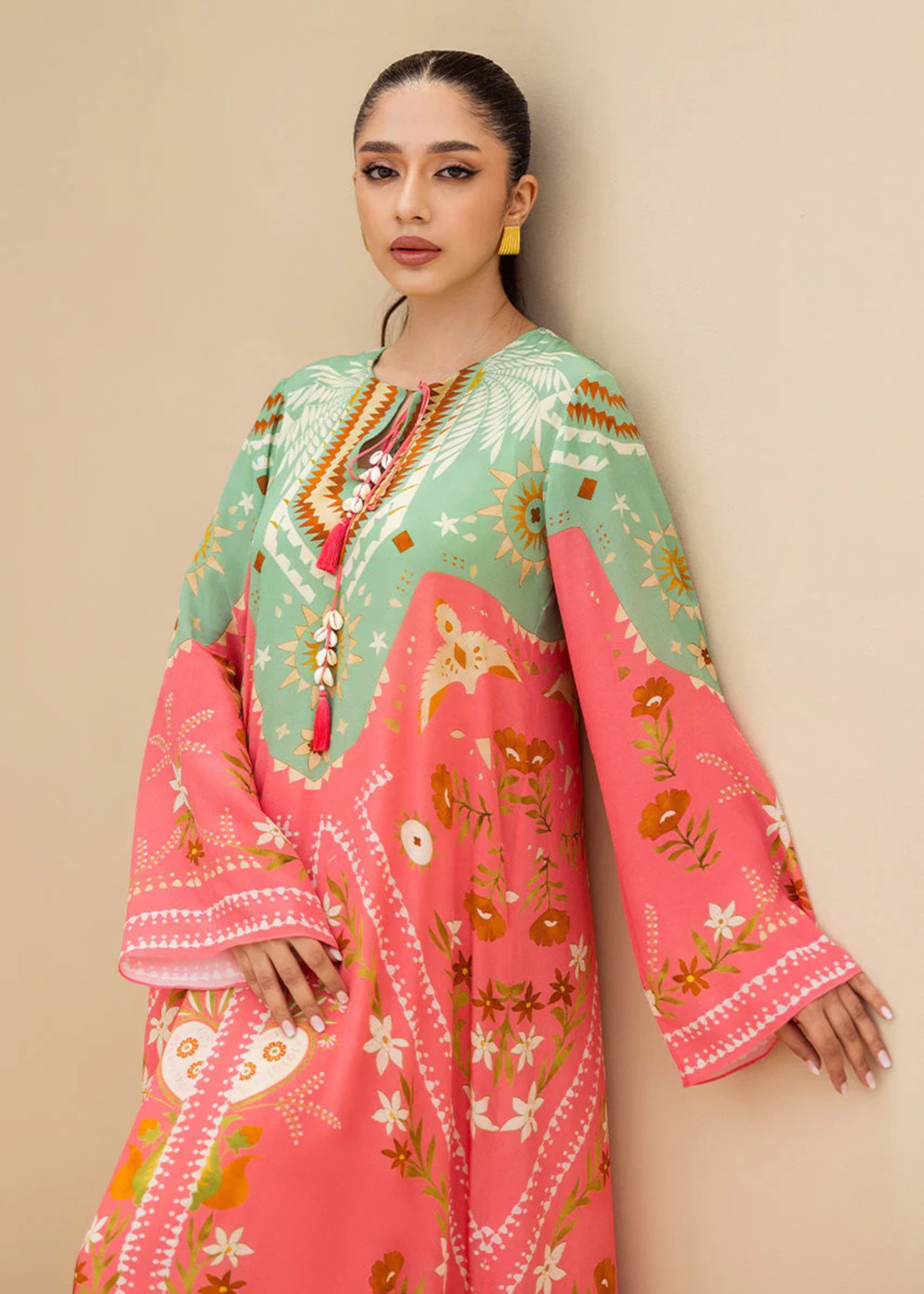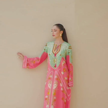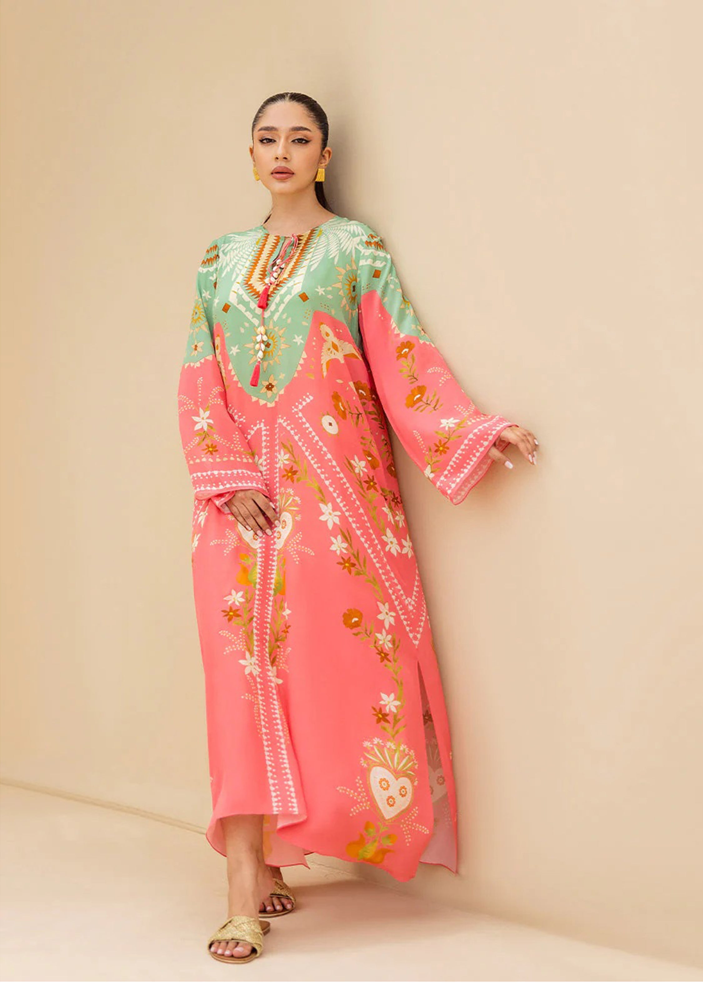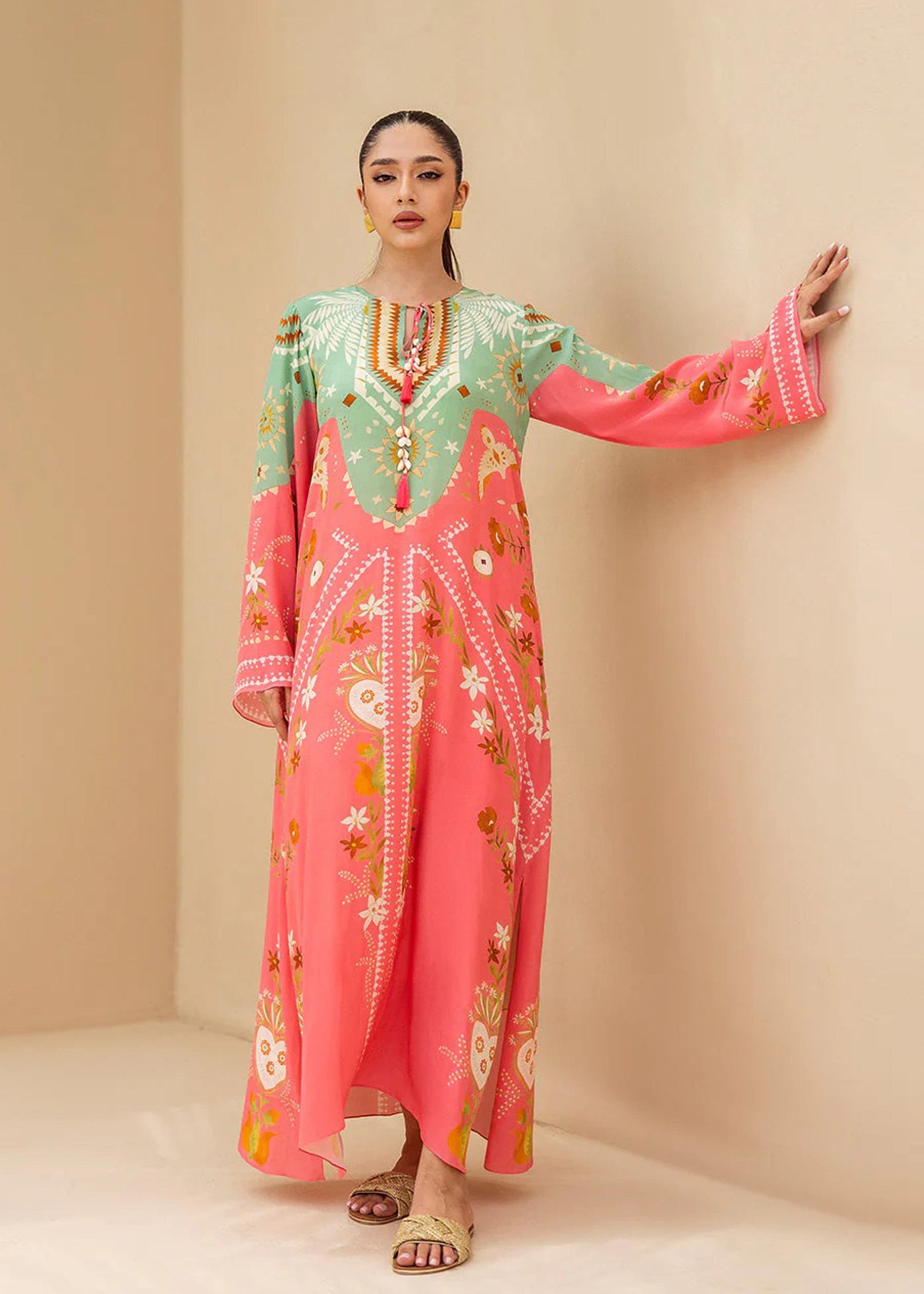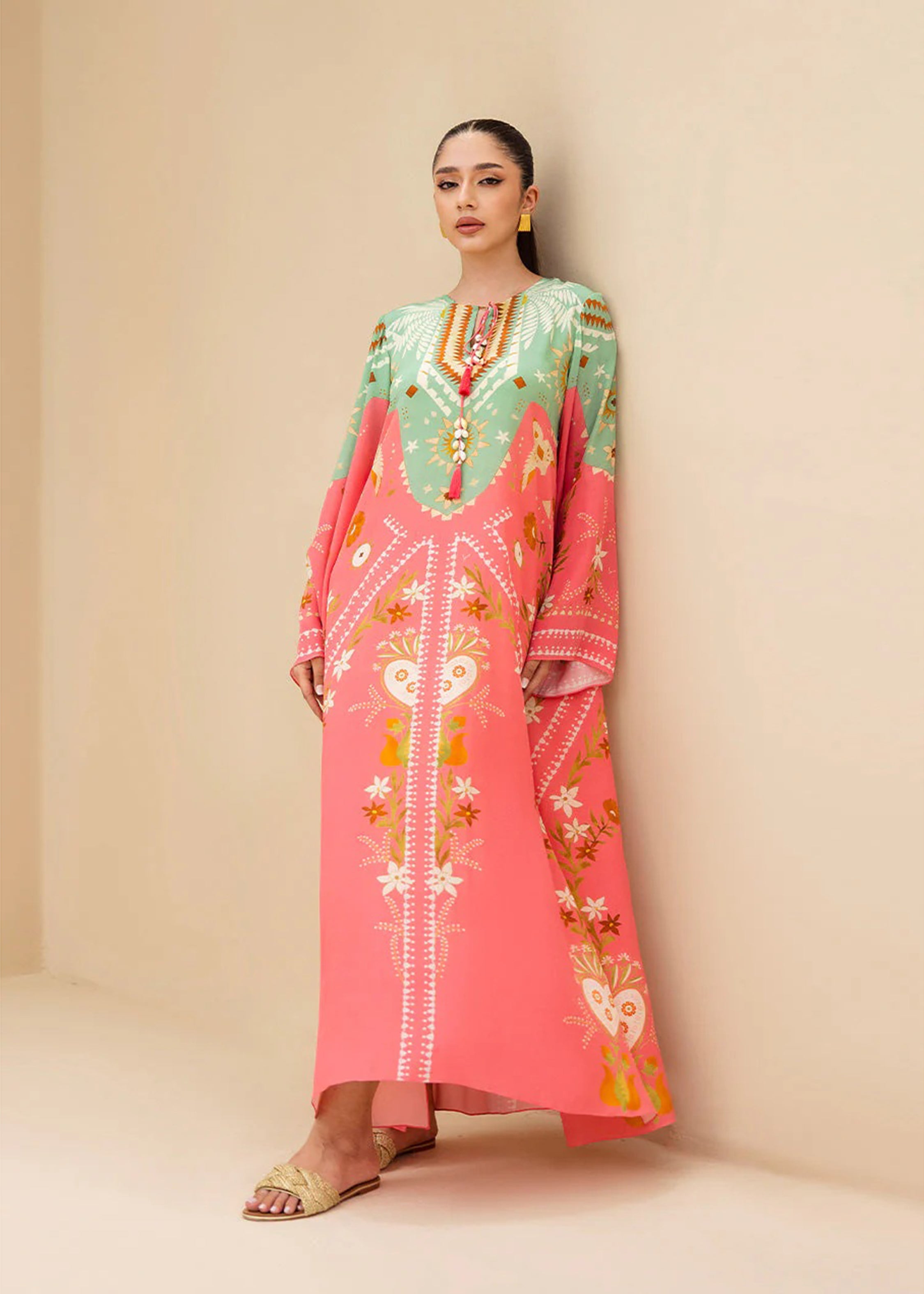 Designed with a relaxed silhouette, the kaftan features wide sleeves and a round neckline with a subtle tie detail, ensuring comfort with effortless sophistication. Ideal for evening soirees, festive gatherings, or elevated resort wear, this piece celebrates timeless charm with a modern touch.