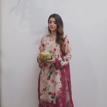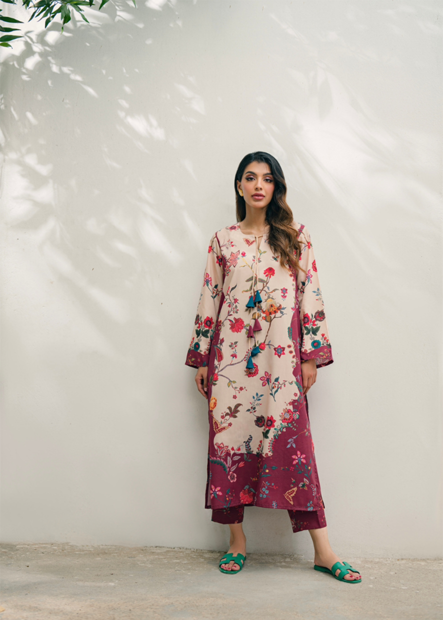 The soft beige base is adorned with vibrant botanical motifs in shades of crimson, teal, and maroon—culminating in rich, contrasting borders at the sleeves and hemline. The kurta features a relaxed fit with straight long sleeves and a rounded neckline, finished with playful tassel ties for a chic touch. Paired with matching straight-cut trousers in a deep maroon hue, this ensemble offers style and comfort in equal measure.