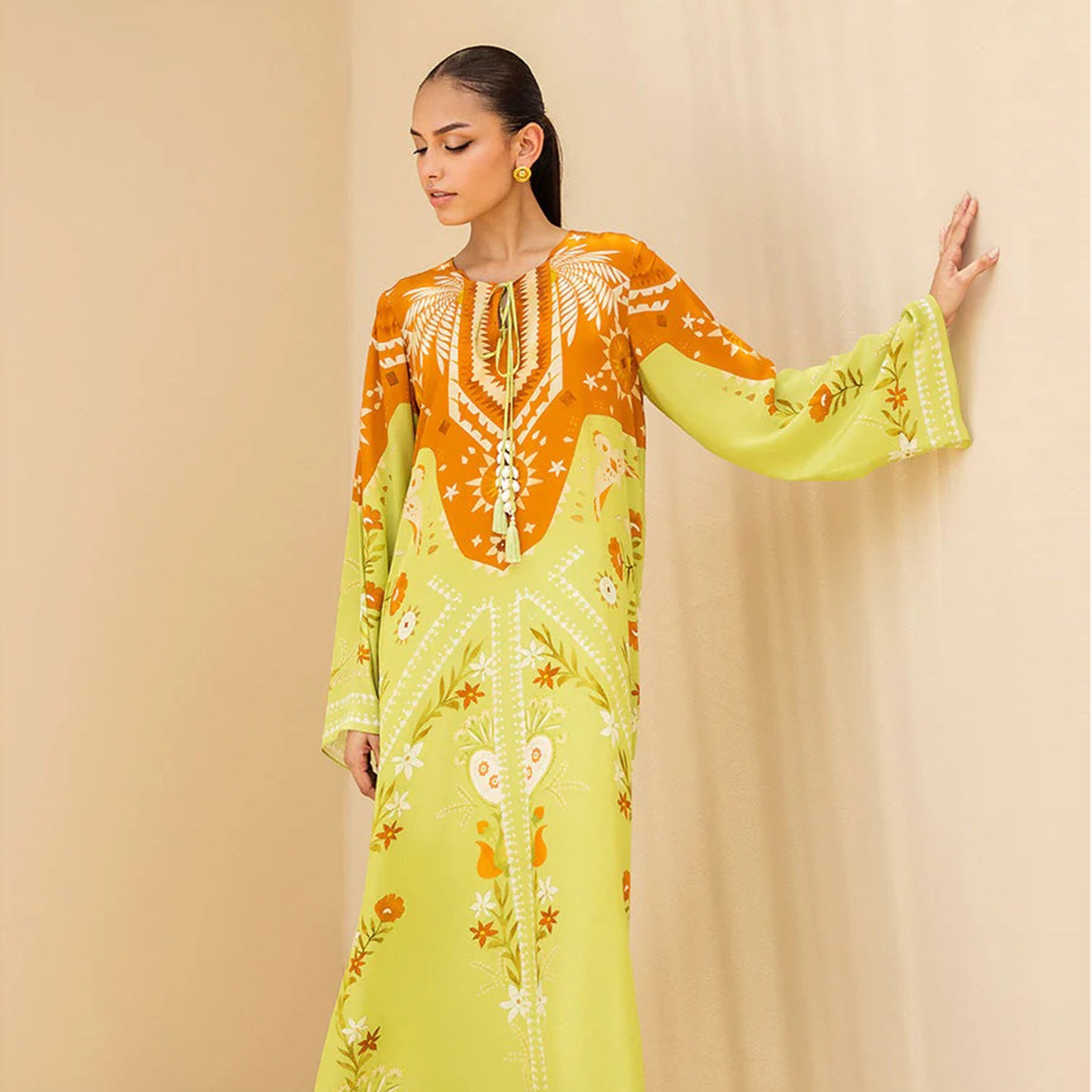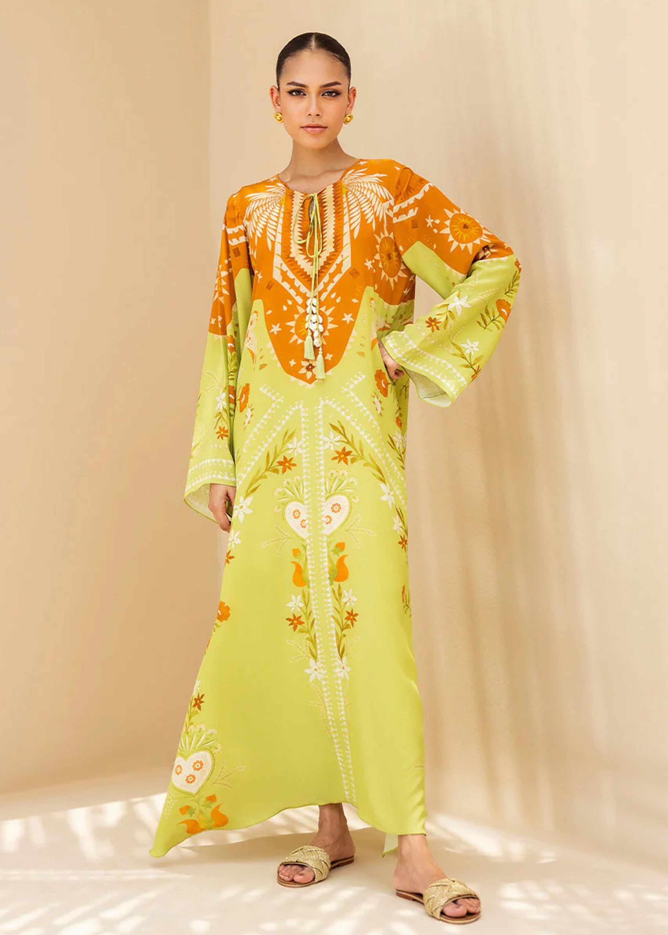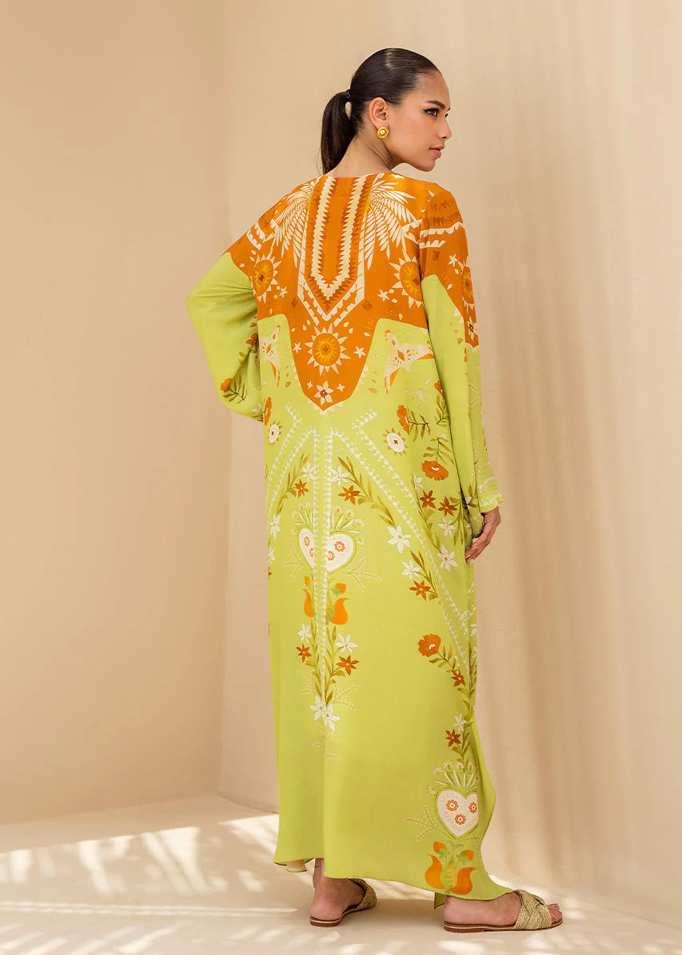 Infuse your wardrobe with vibrant energy with our Sunset Bloom Kaftan, a radiant creation in premium soft crepe. Designed in a striking dual-tone palette of rich sunset orange and refreshing lime, the kaftan is adorned with intricate floral and geometric motifs in ivory and warm golden hues. Its flowing silhouette and wide sleeves make it a statement of effortless elegance and cultural artistry.