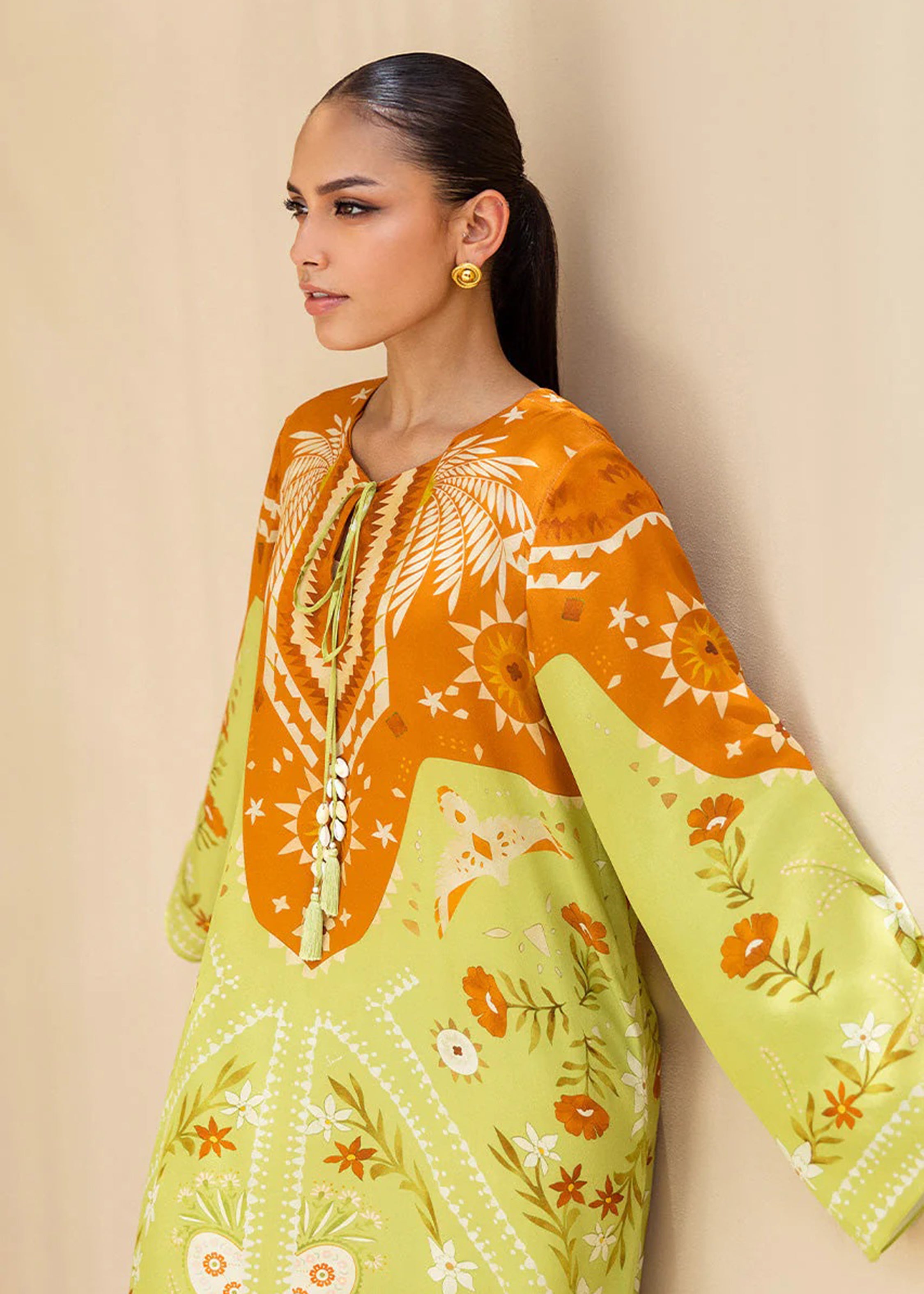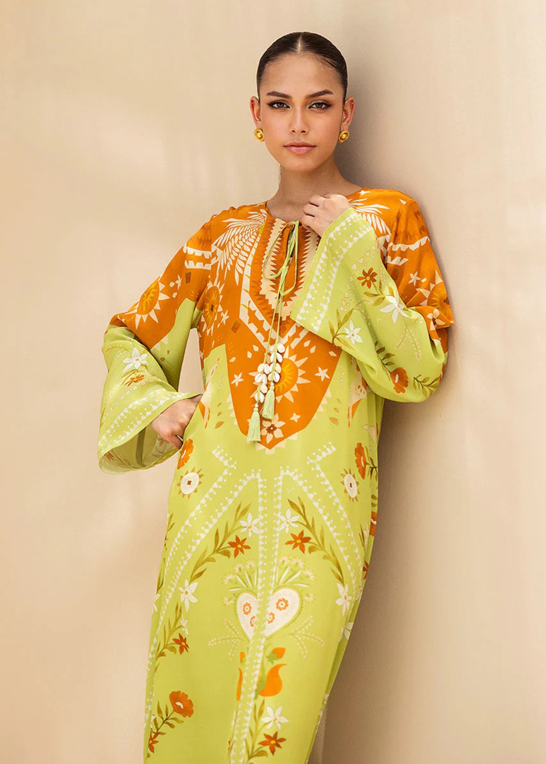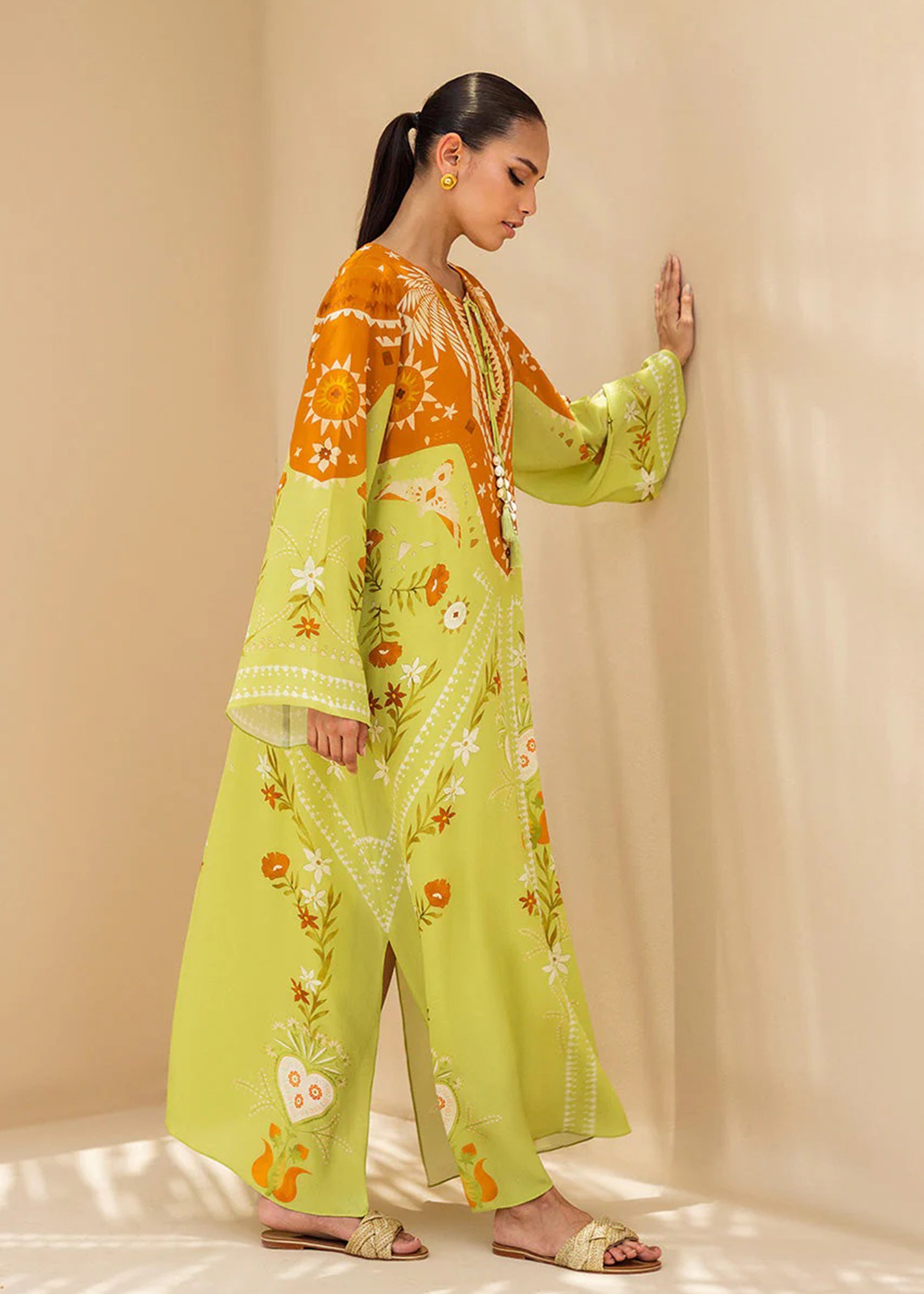 Infuse your wardrobe with vibrant energy with our Sunset Bloom Kaftan, a radiant creation in premium soft crepe. Designed in a striking dual-tone palette of rich sunset orange and refreshing lime, the kaftan is adorned with intricate floral and geometric motifs in ivory and warm golden hues. Its flowing silhouette and wide sleeves make it a statement of effortless elegance and cultural artistry.