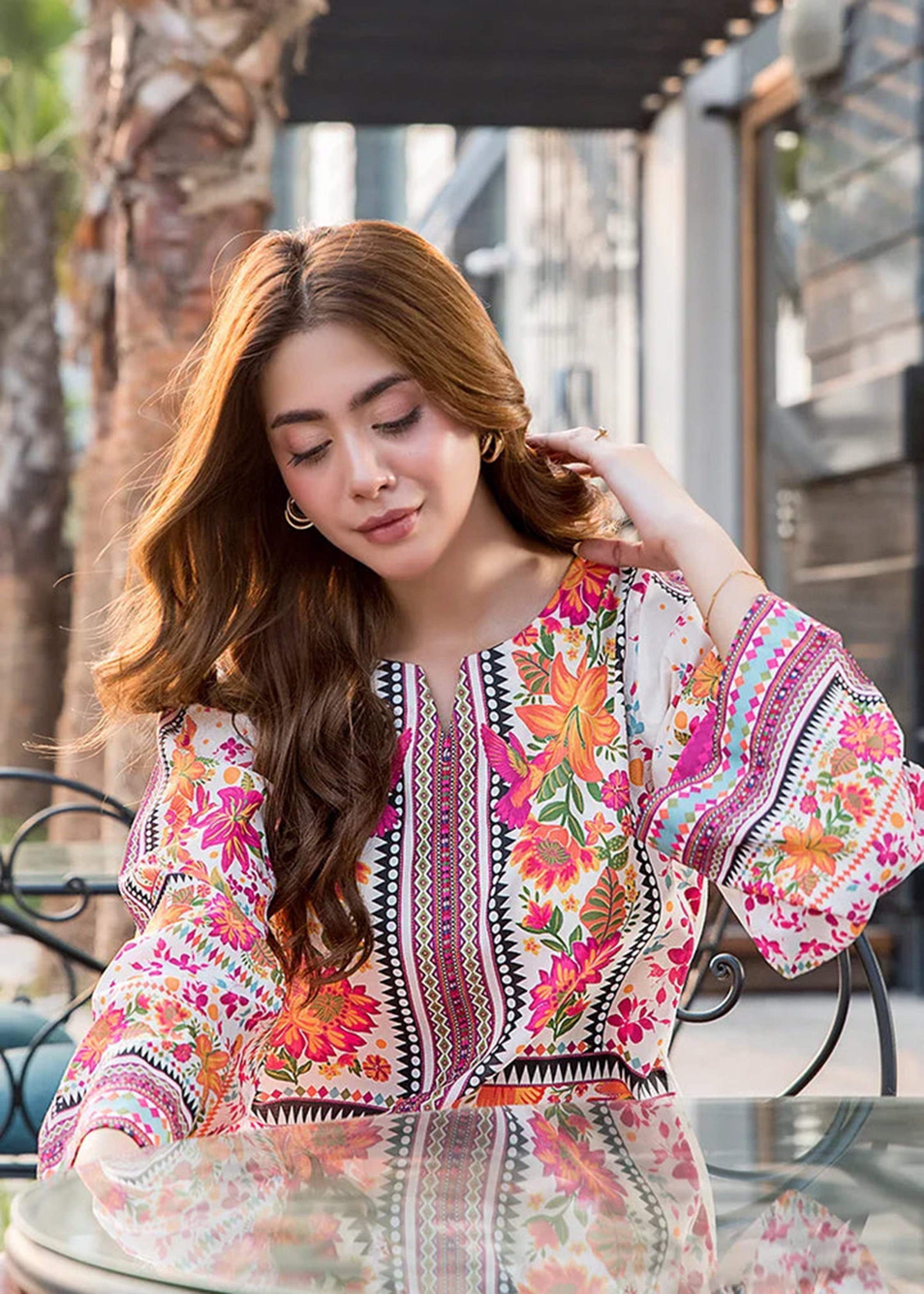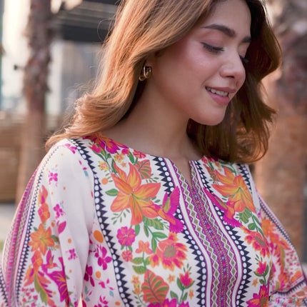 Radiate joy and confidence in our Tropical Bloom Kaftan Set, crafted in soft and breathable natural crepe. This two-piece ensemble features a stunning kaftan silhouette with a front-open design and a riot of floral and tribal-inspired digital prints in hues of hot pink, tangerine, yellow, and black — making it the perfect statement look for warm-weather outings.