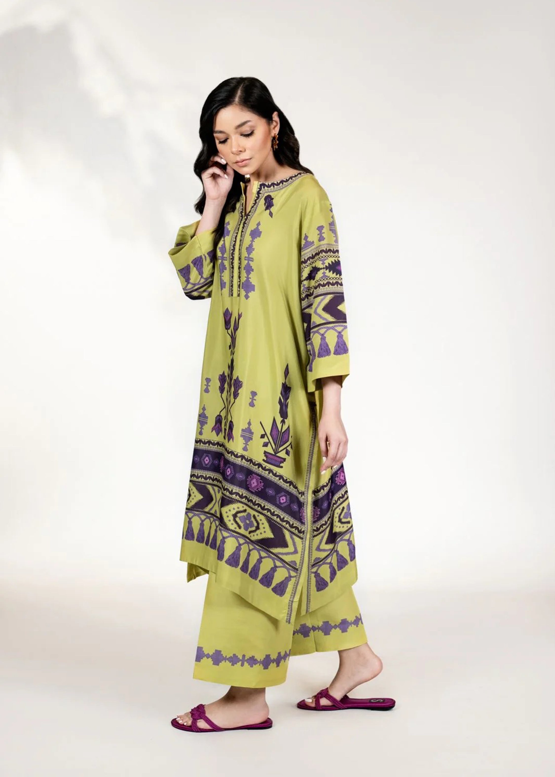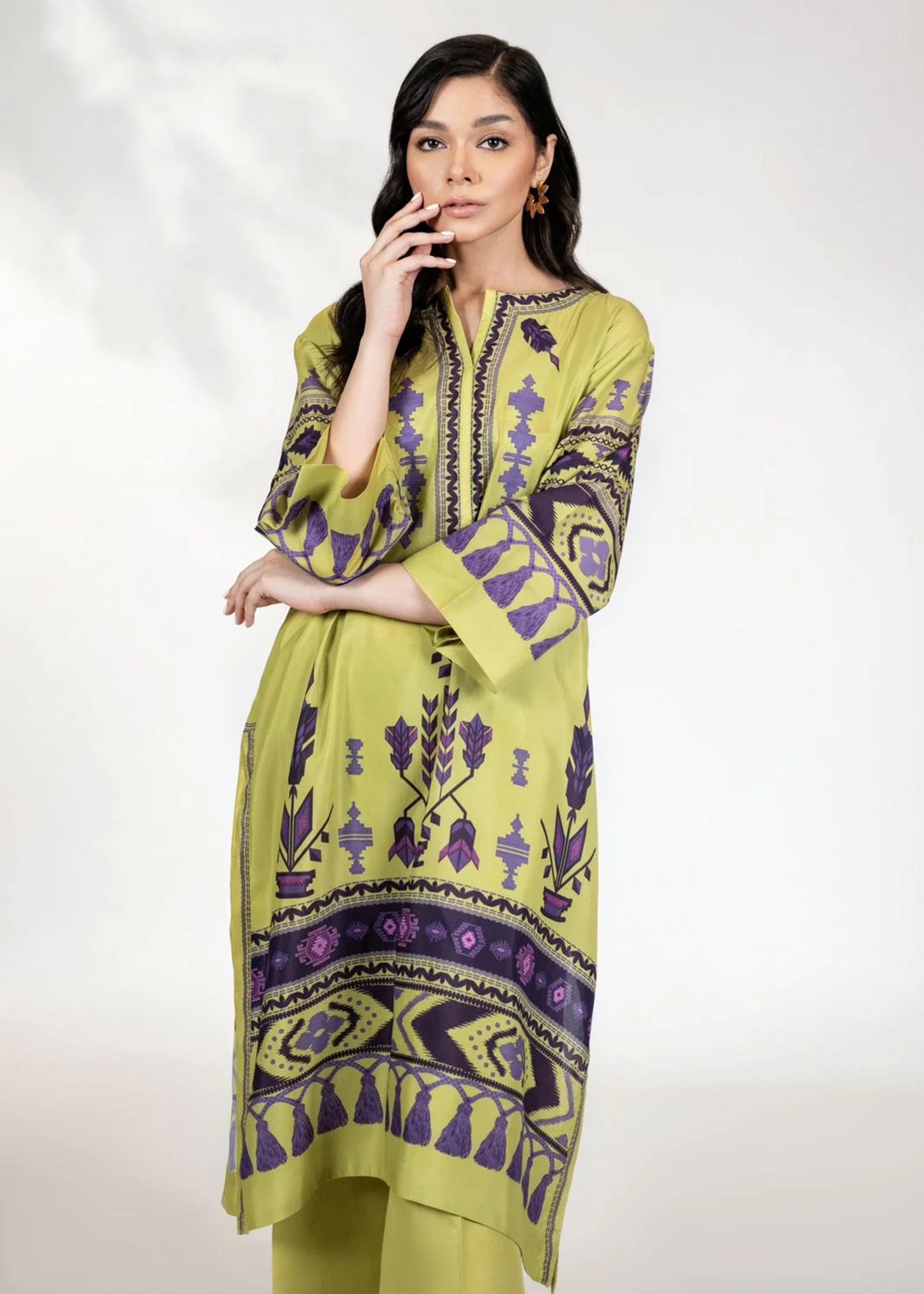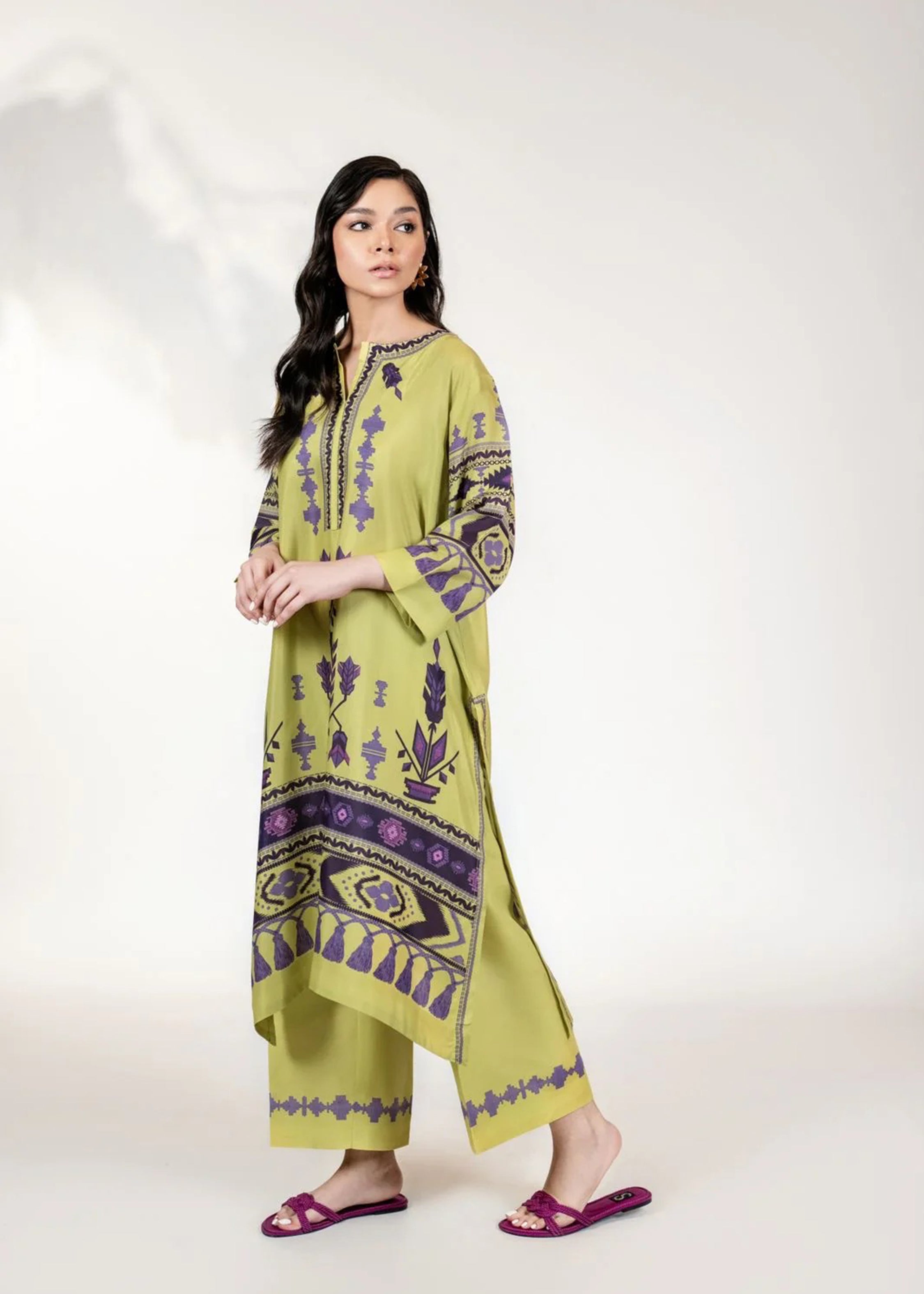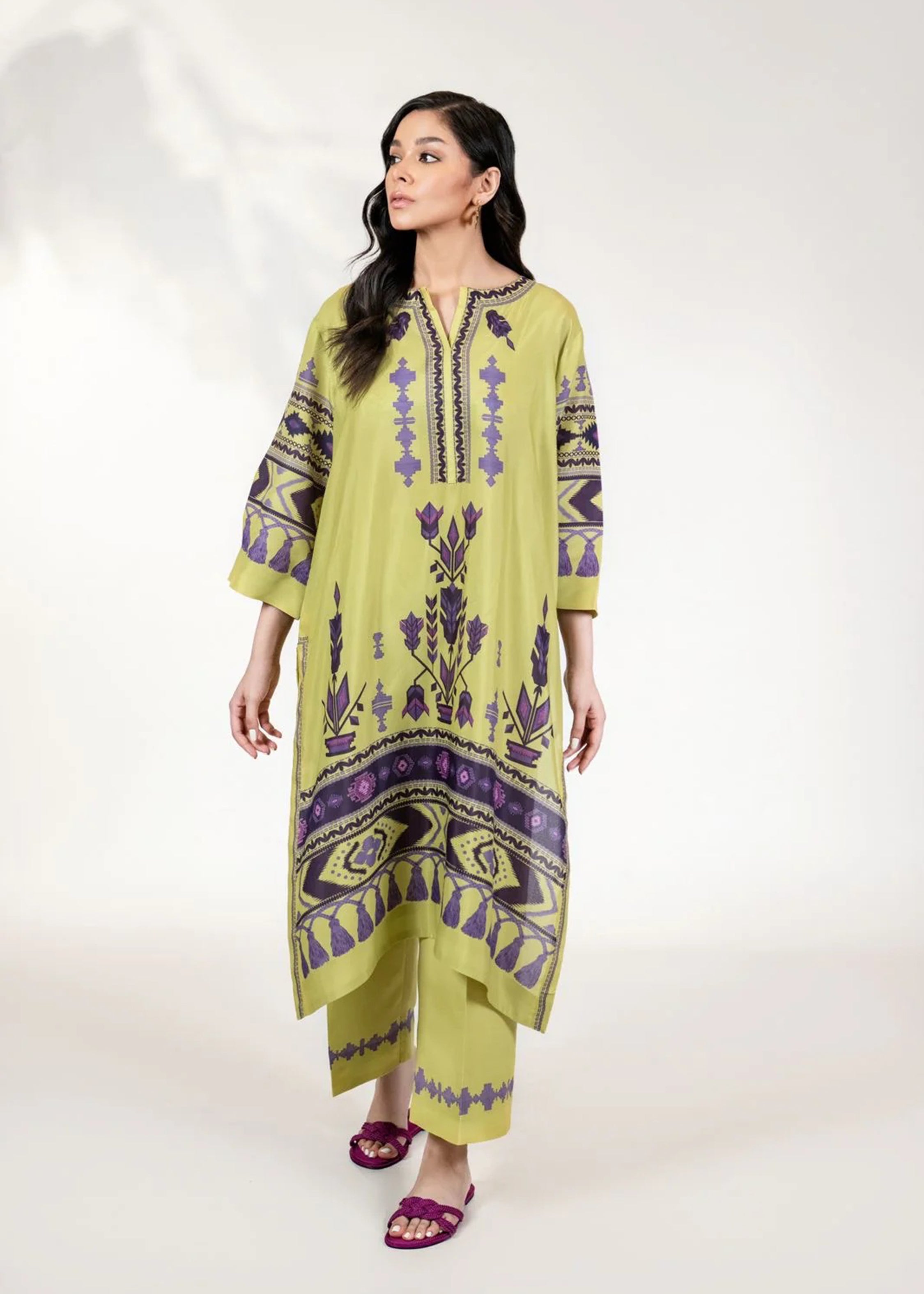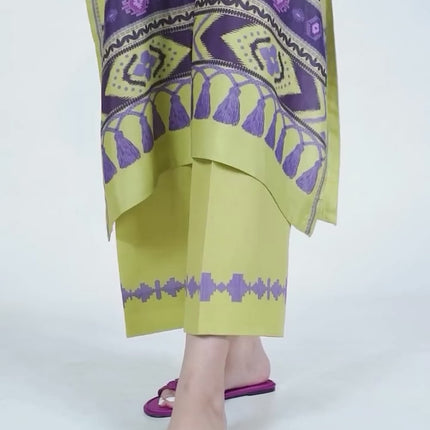 Brighten your wardrobe with the Verdant Orchid, a refreshing blend of modern artistry and cultural charm. Crafted in a soft cotton satin blend, this ensemble features a lively lime base adorned with striking geometric and floral motifs in deep purple — a vibrant contrast that celebrates bold elegance.