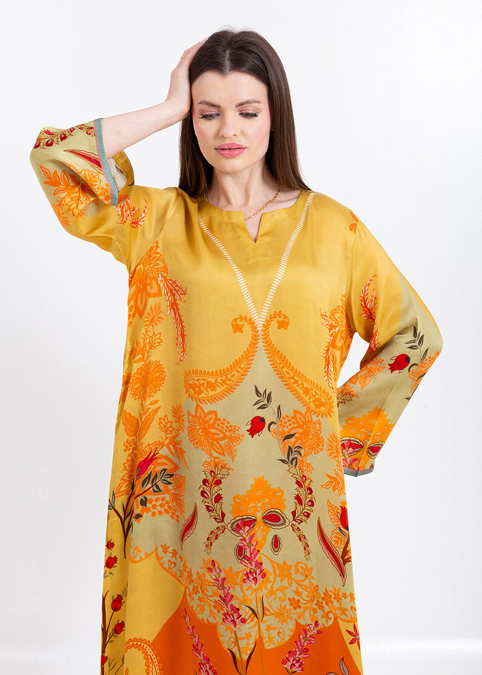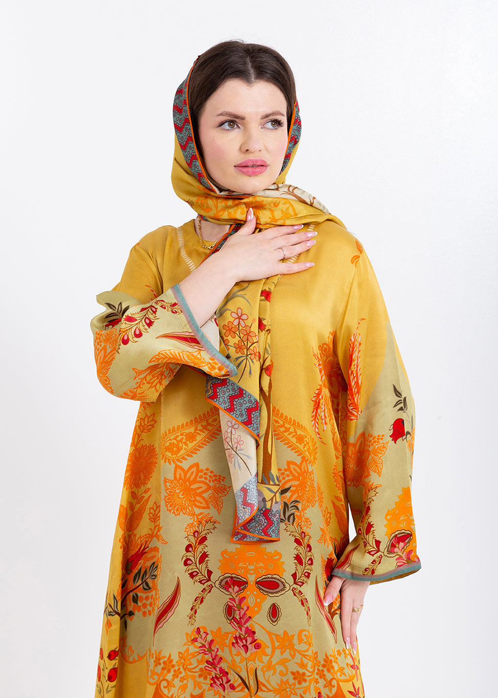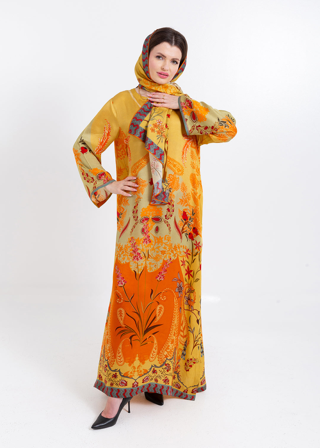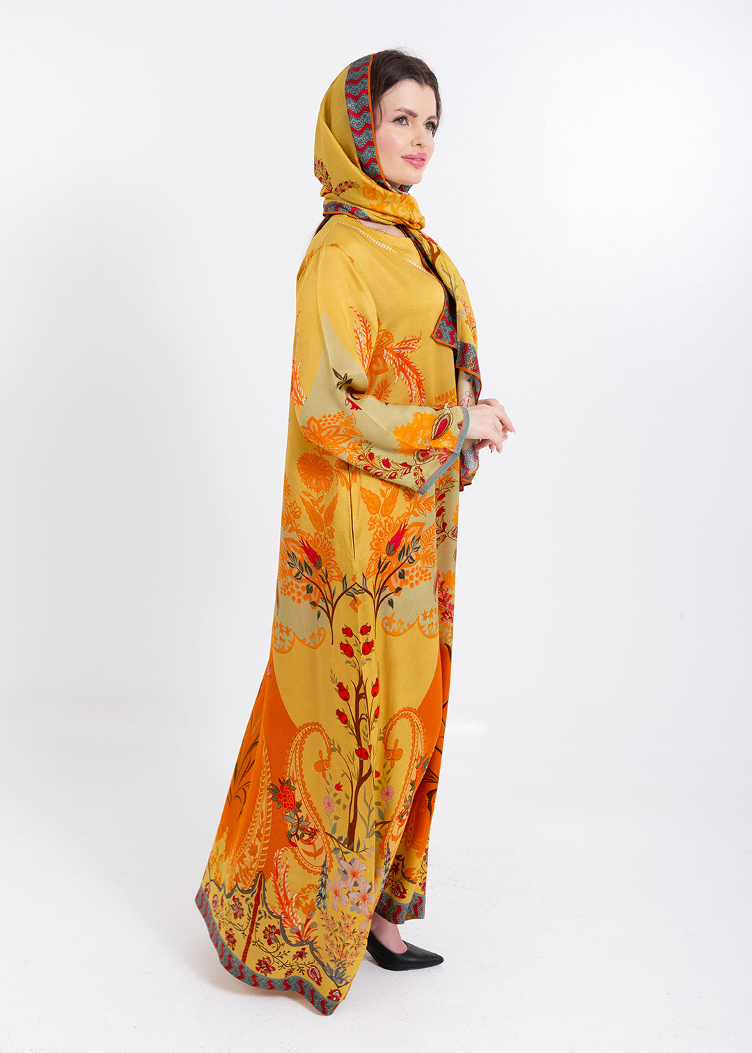 Zahra Mustard Yellow Cupro Satin Kaftan Set with Matching Scarf