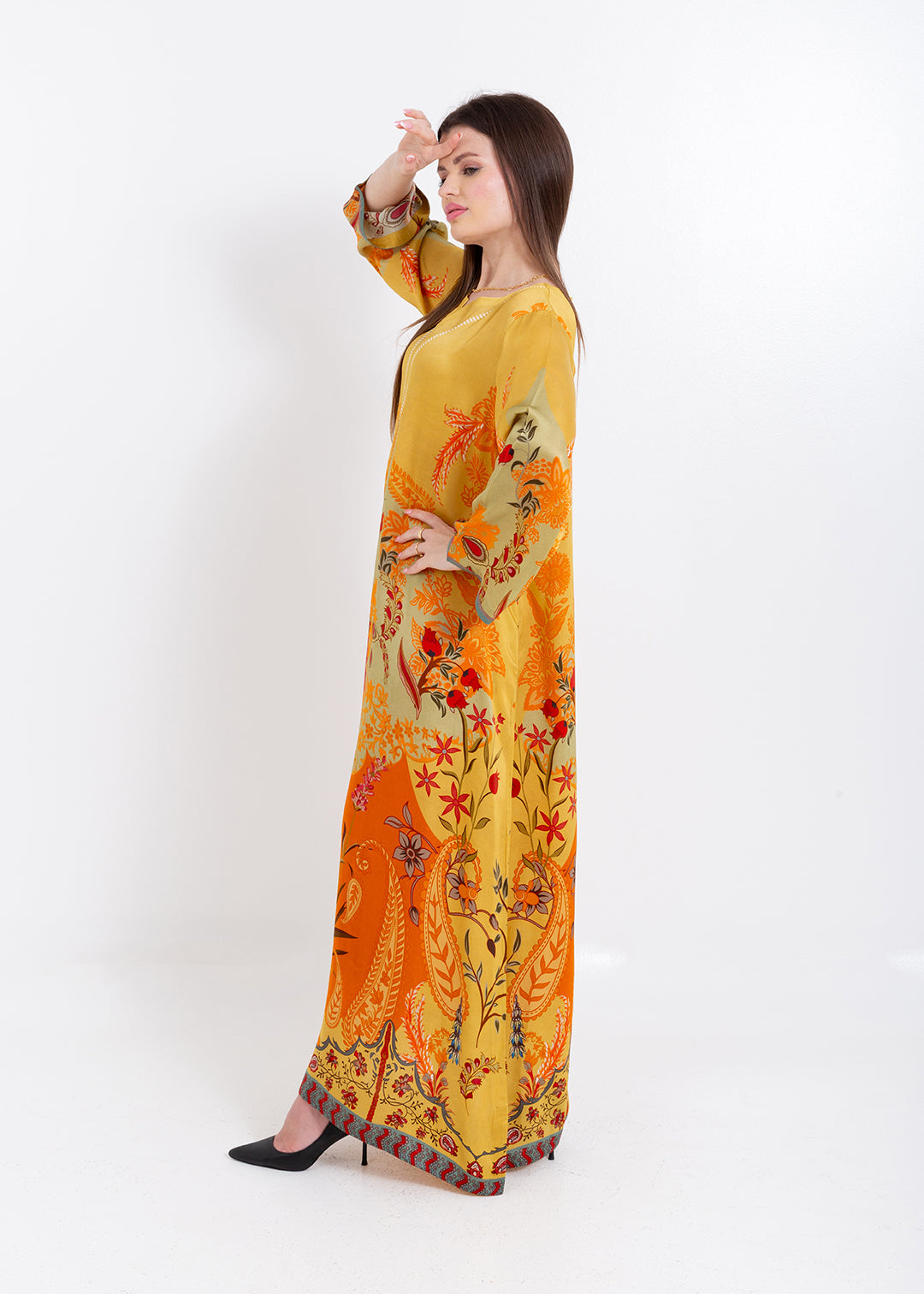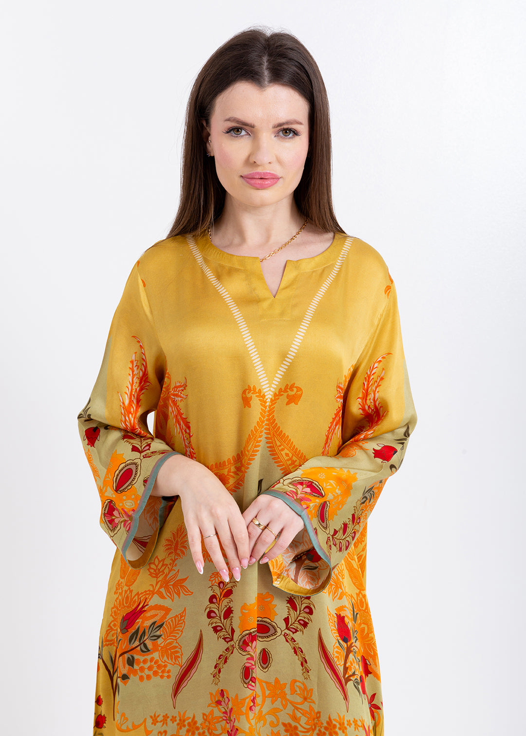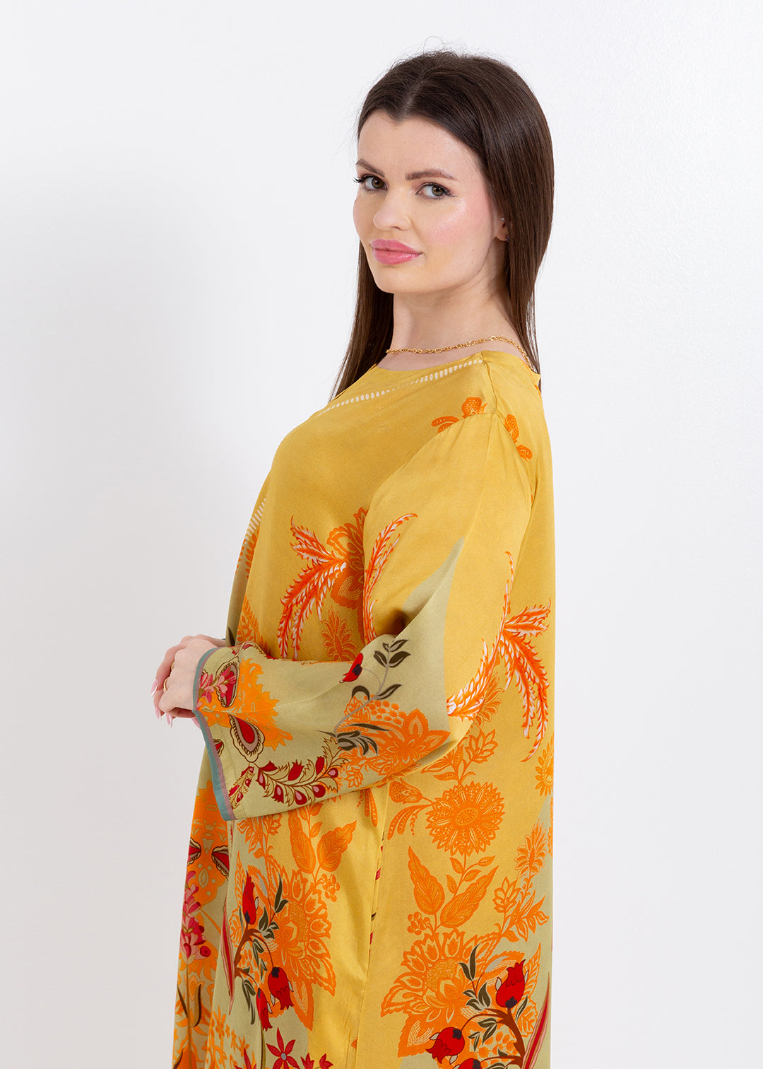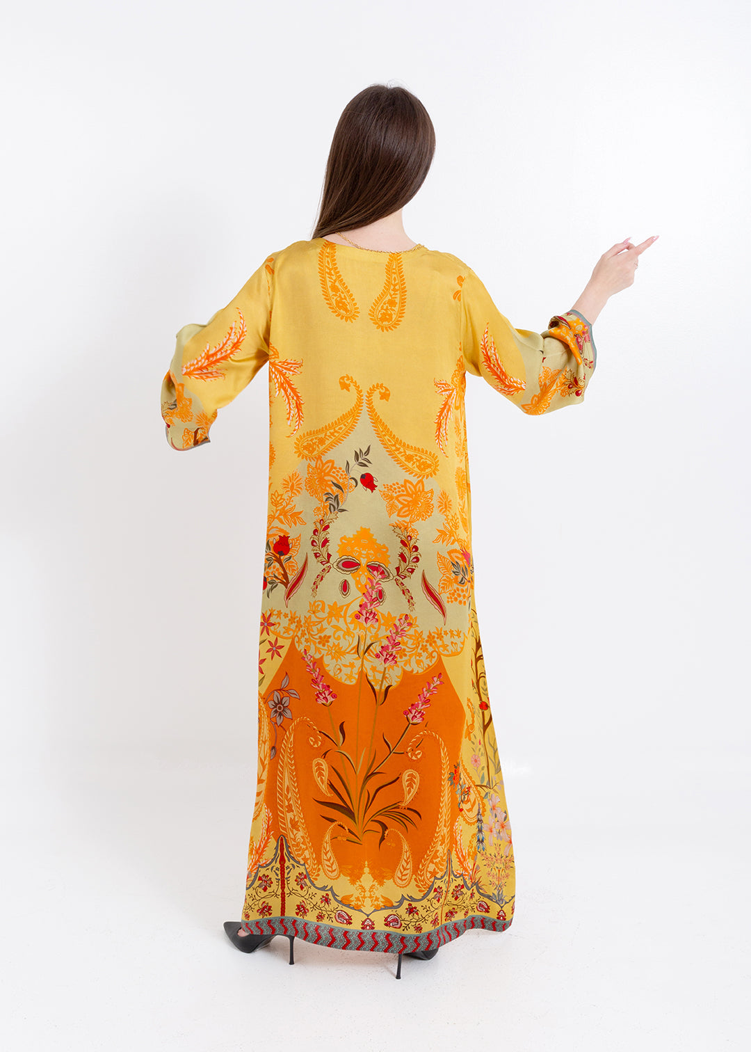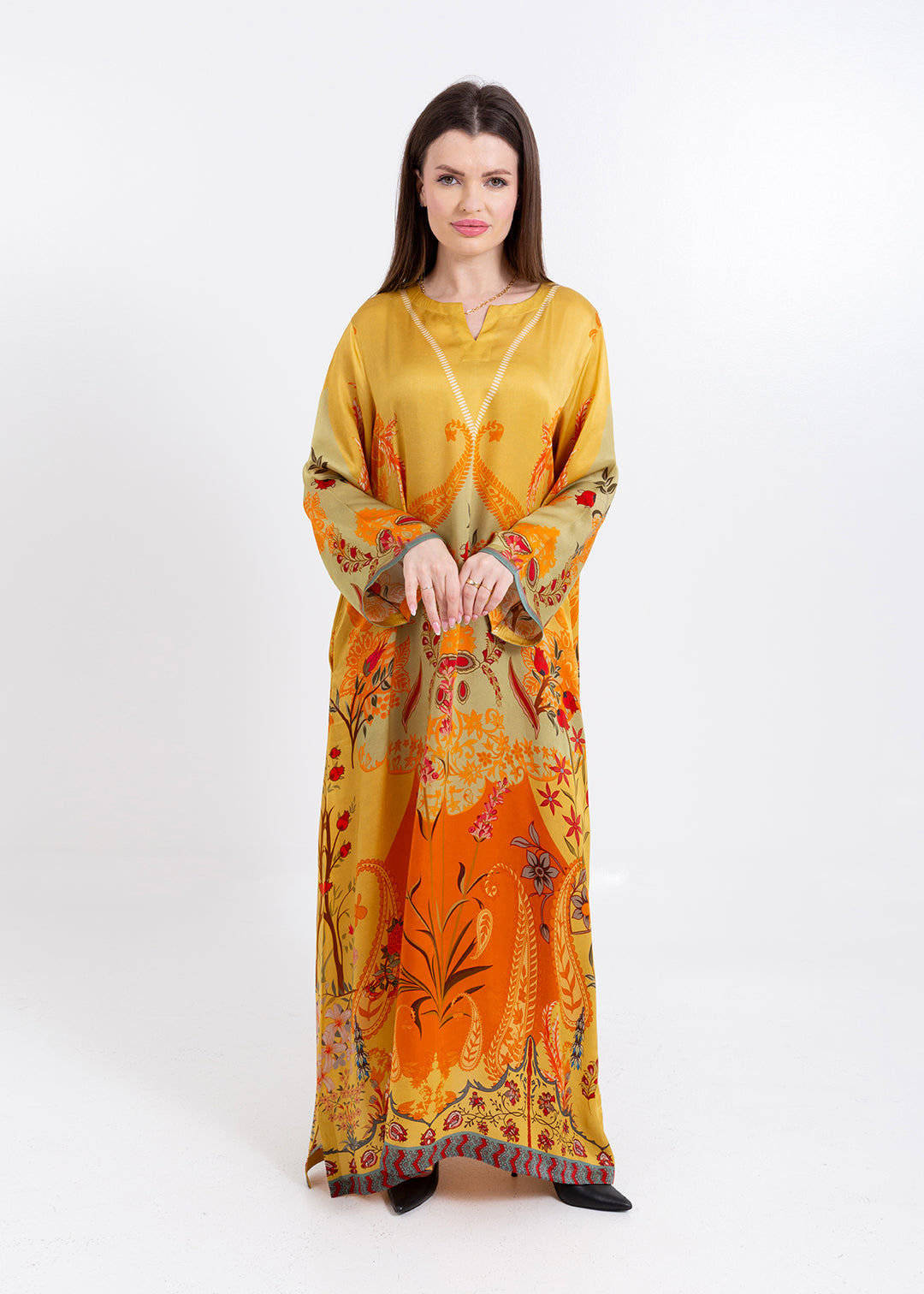Zahra Mustard Yellow Cupro Satin Kaftan Set with Matching Scarf