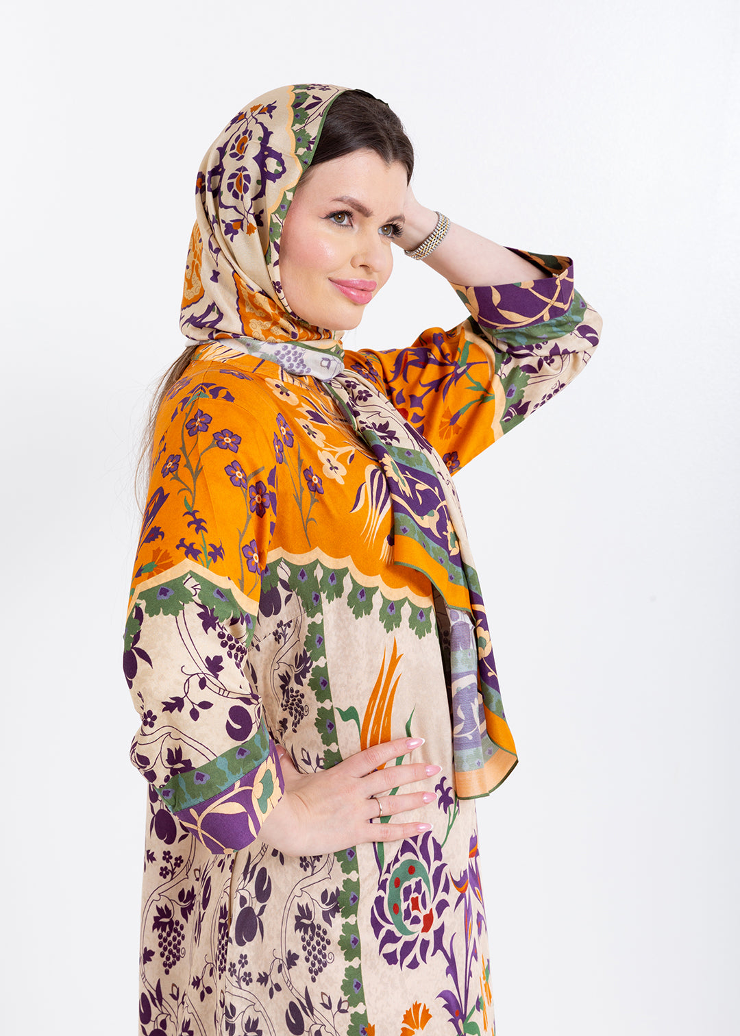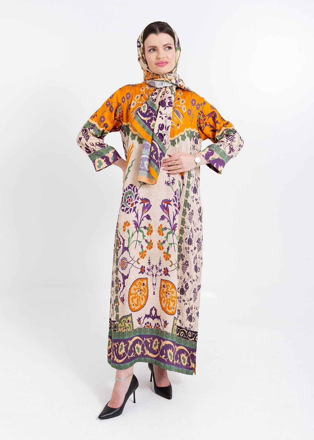 Zoya Ivory Amber Cupro Satin Kaftan Set with Matching Scarf